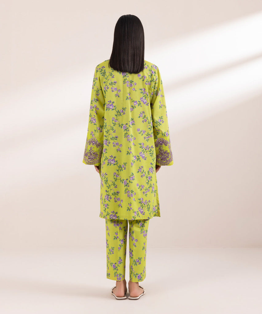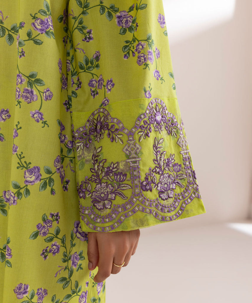 Printed Front with Embroidery, Printed Back, Full Sleeves, Round Neckline with slit