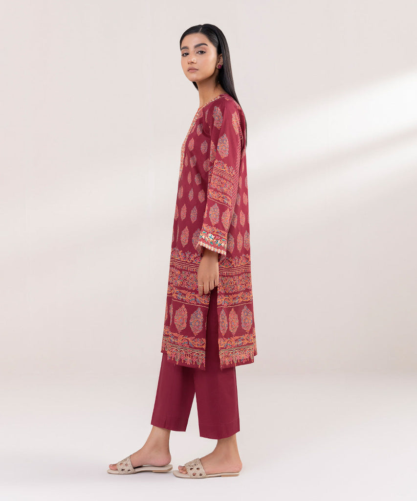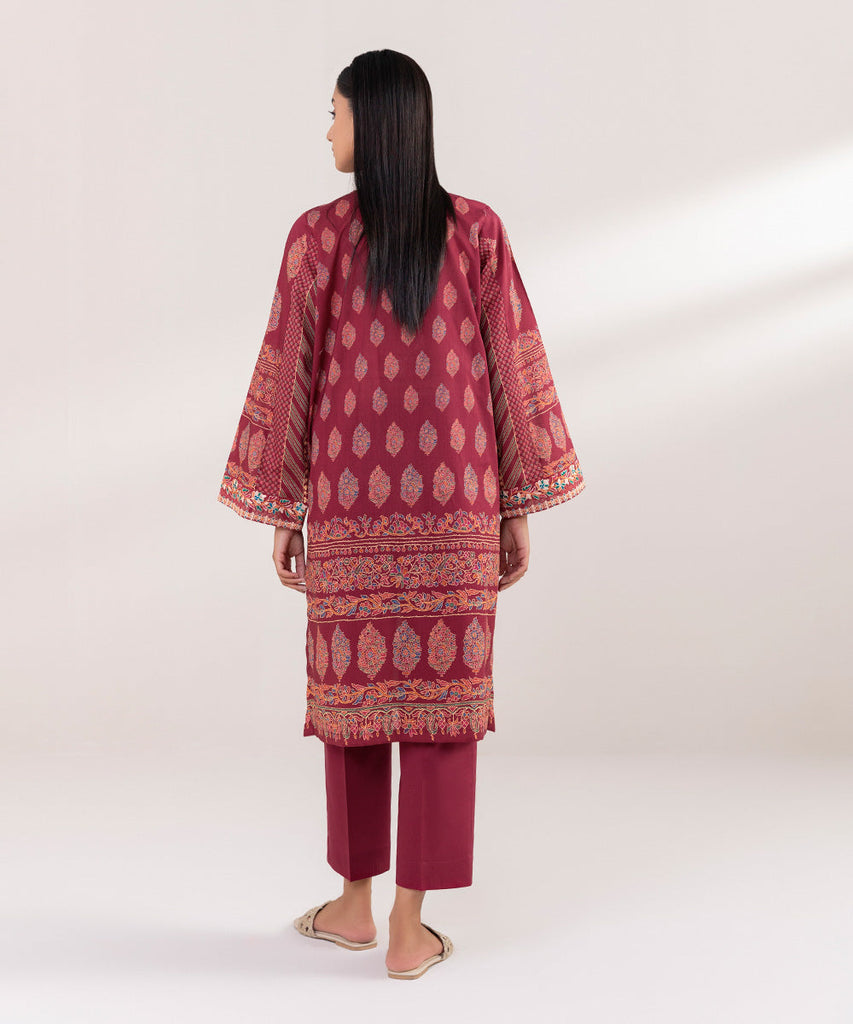 Printed Front with Embroidery, Printed Back, Full Sleeves, Round Neckline with slit