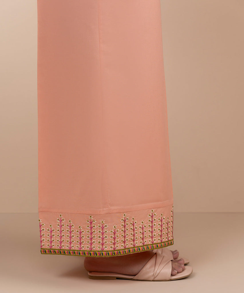 Complete your outfit with our peach pink, cambric embroidered culottes.