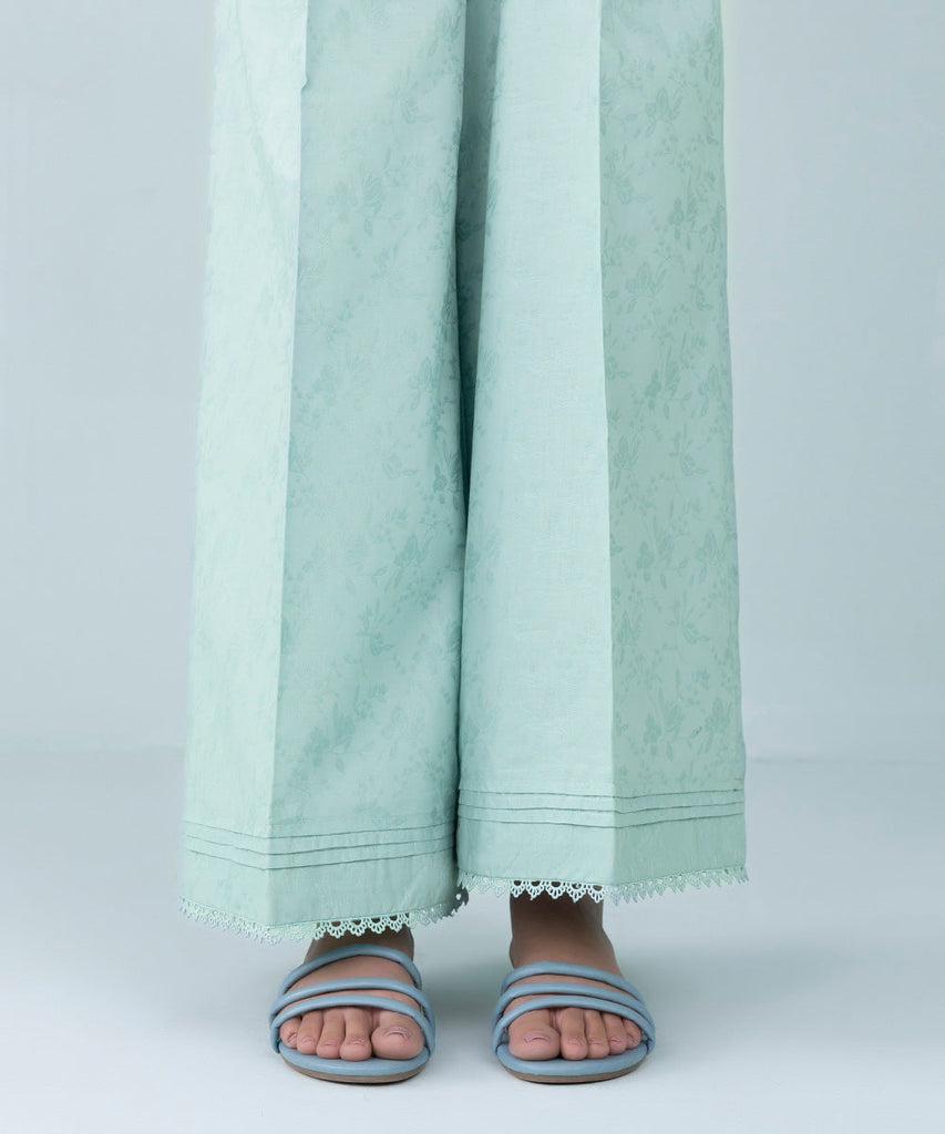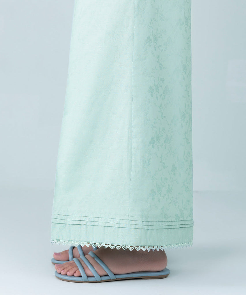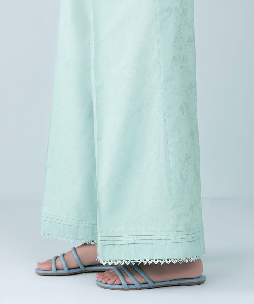 Elevate your Eid outfit in our pastel blue, cotton jacquard flared pants featuring lace detailing.