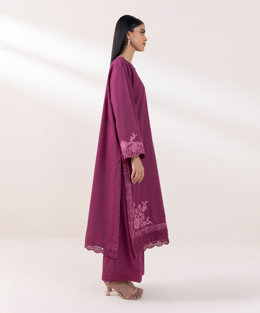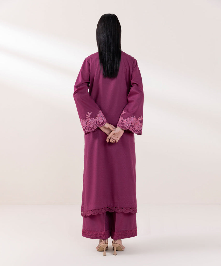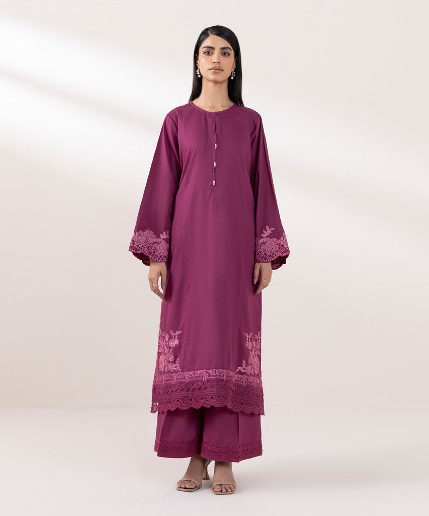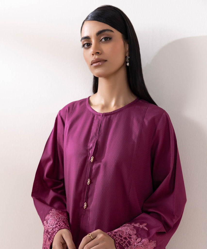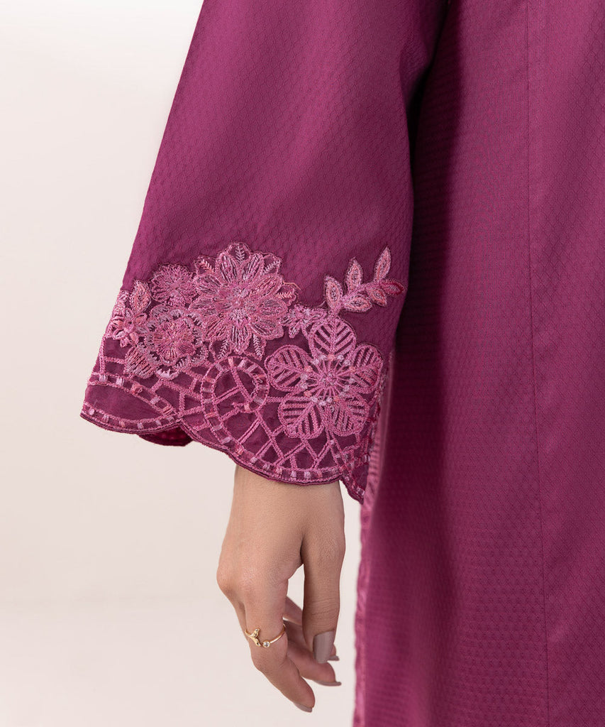 For a chic festive look style our magenta, long A-line dobby shirt decorated with lace and embroidery.