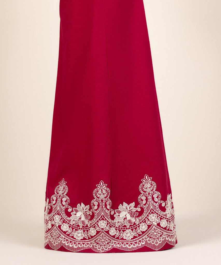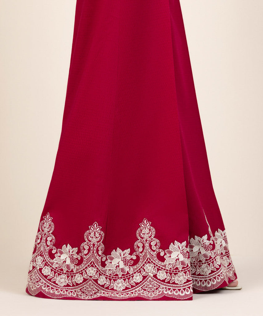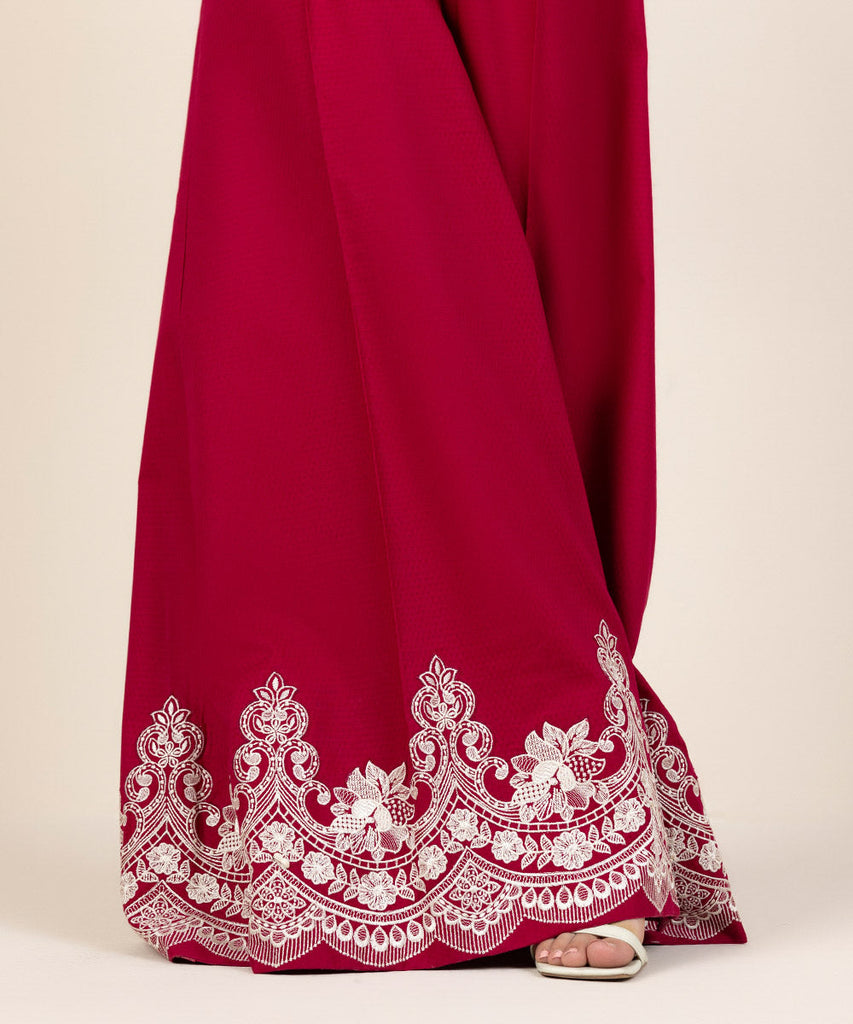 Complete your Eid look in our bright red dobby flared pants with embroidery.