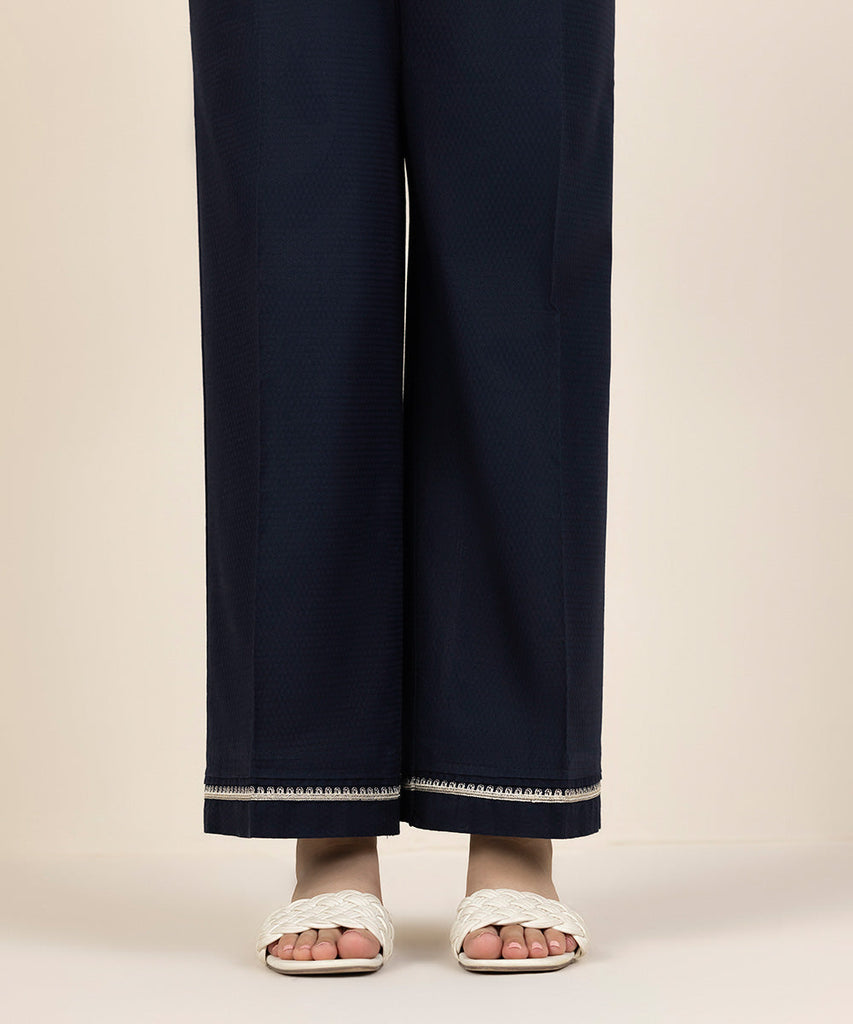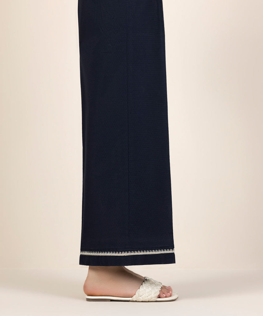 Complete your Eid look in our deep blue dobby culottes with embroidery.