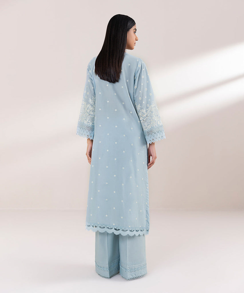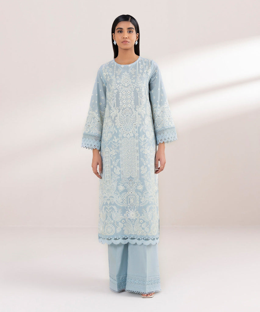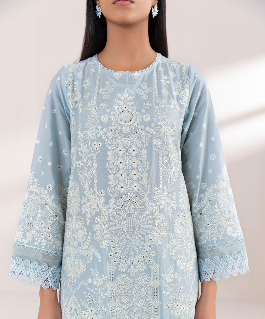 Elevate your festive style with our pastel blue A-line embroidered shirt featuring a round neckline.