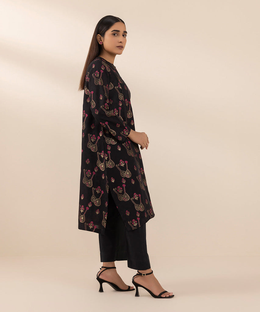 Curate the perfect Eid look with our black, A-line flared shirt featuring a crew neckline with slit.