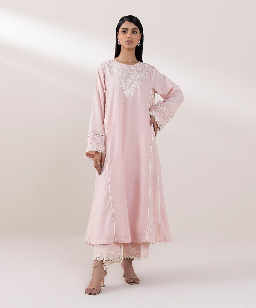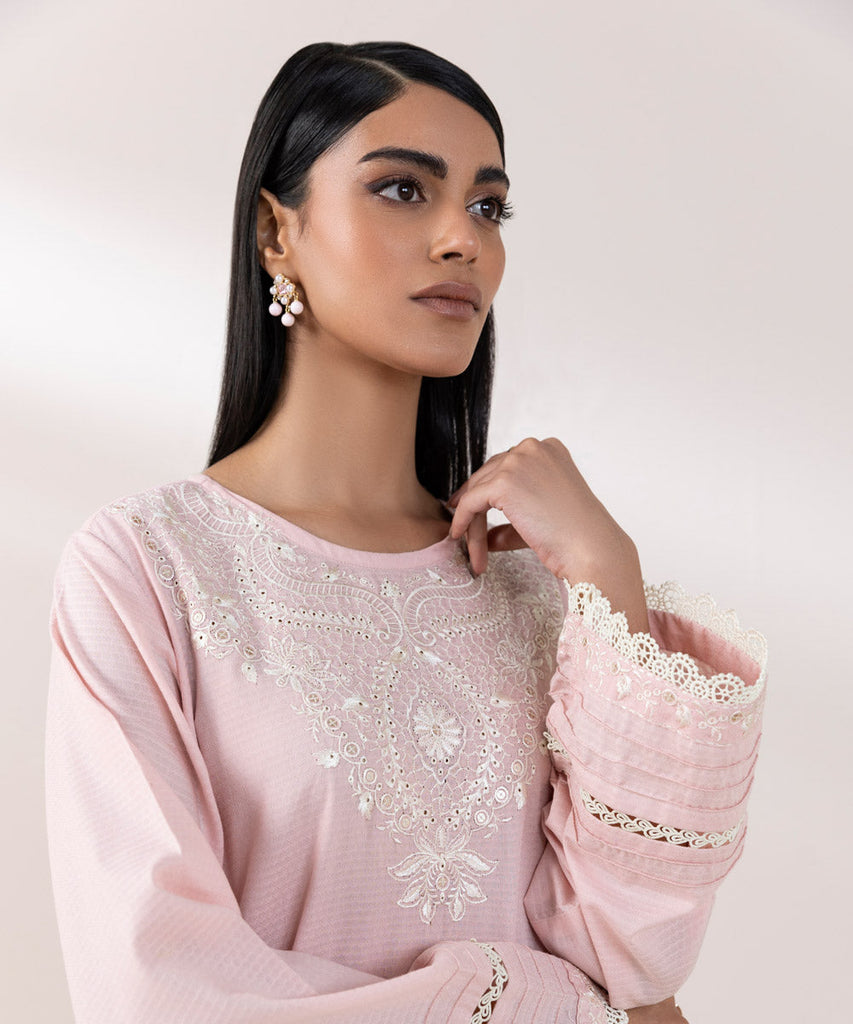 For a chic festive look style our pastel pink, flared A-line dobby shirt decorated with lace and embroidery.