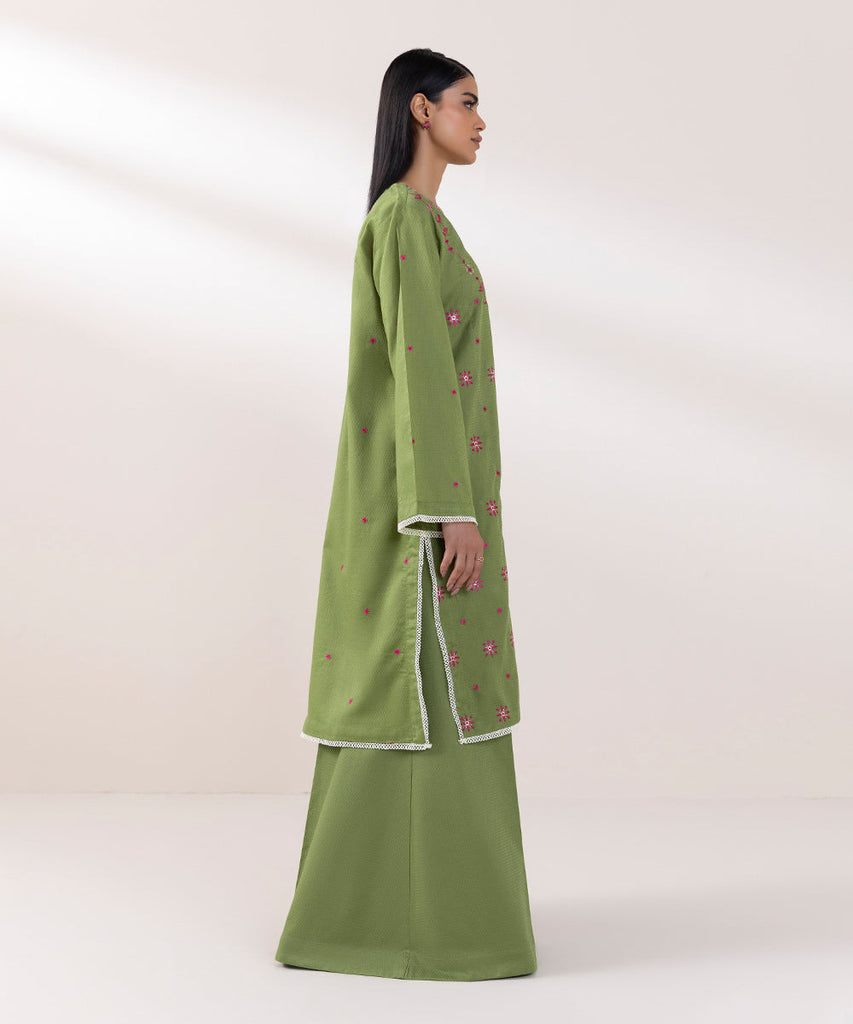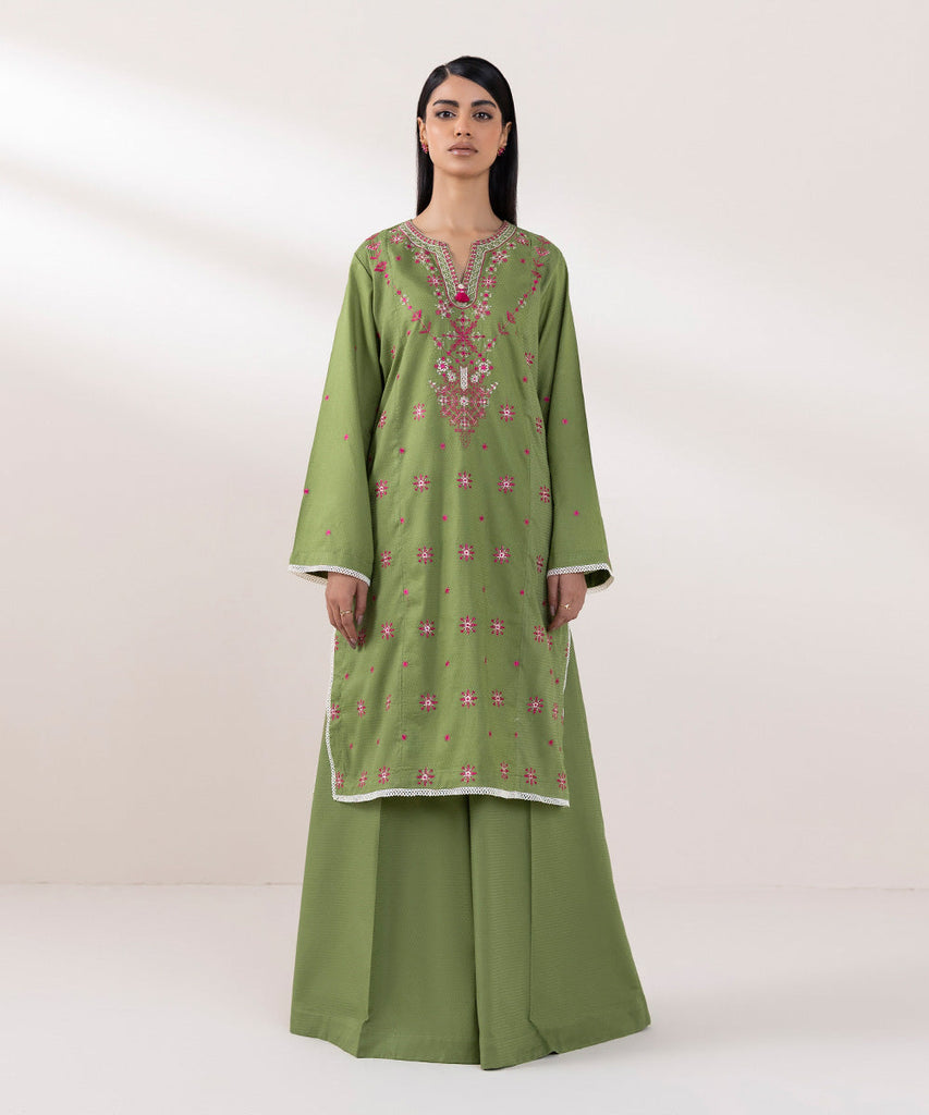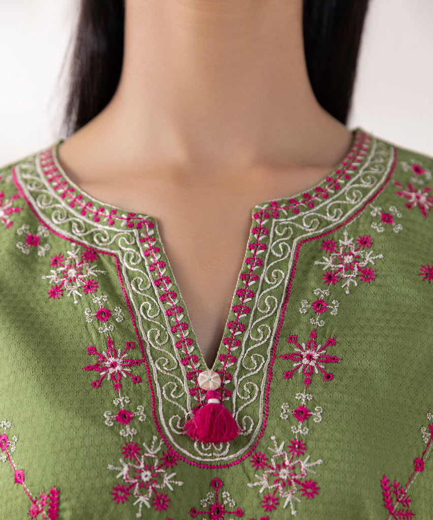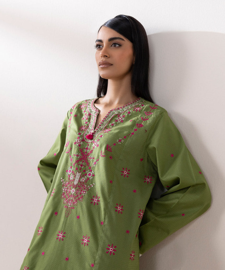 For a chic festive look style our grass green, A-line dobby shirt decorated with embroidery.