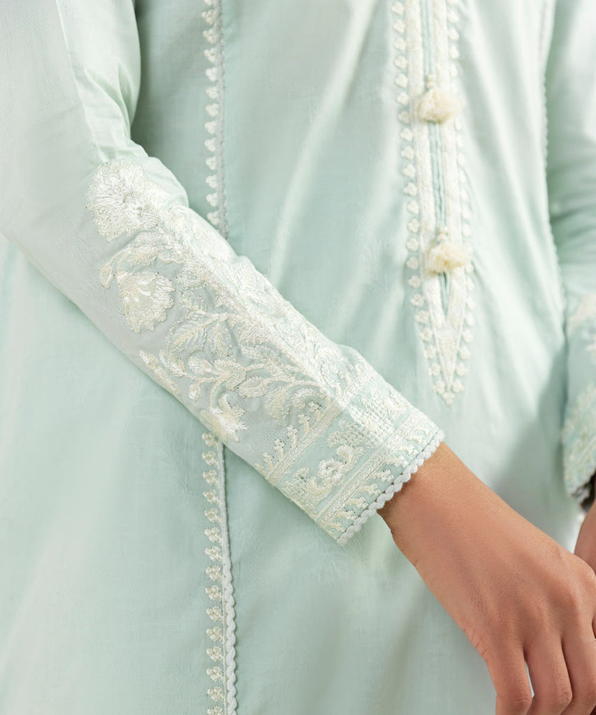 Elevate your festive look with our A-line embroidered mint green shirt, featuring a round neckline with slit and tassels.