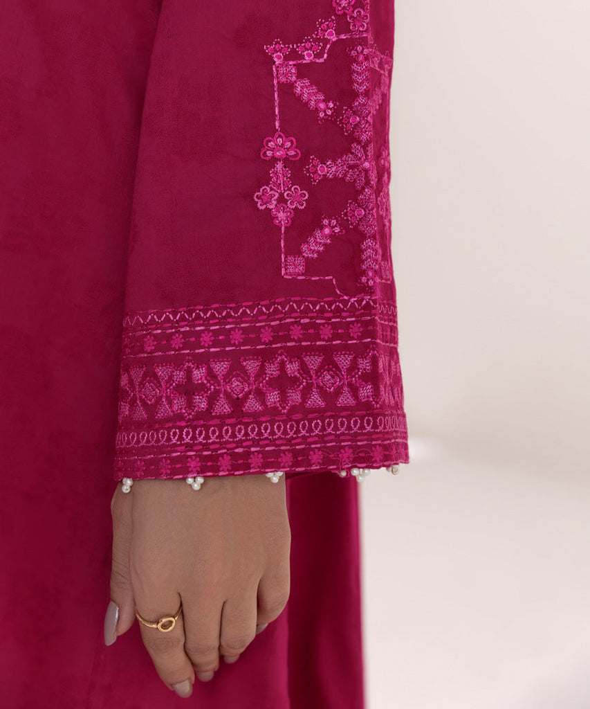 Complete your Eid look with our embroidered A-line flared shirt in deep pink.