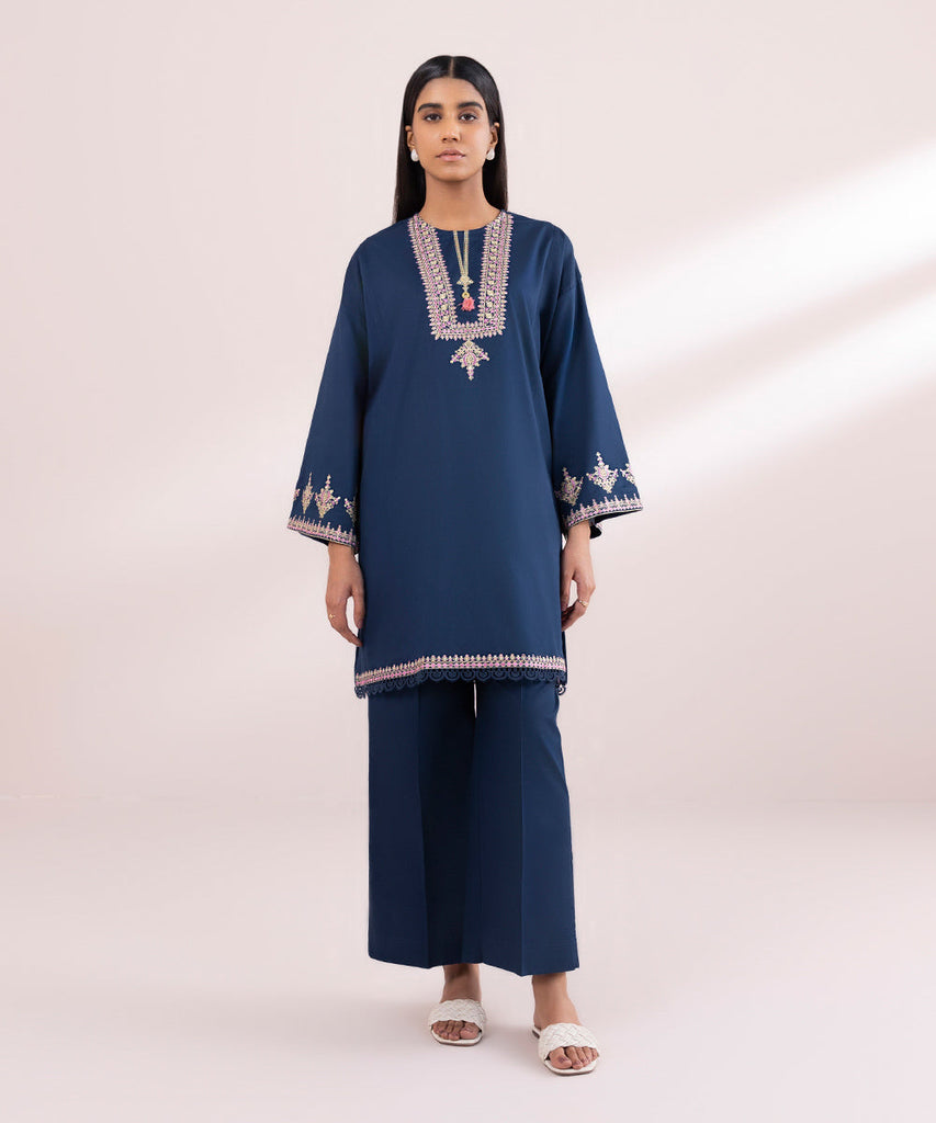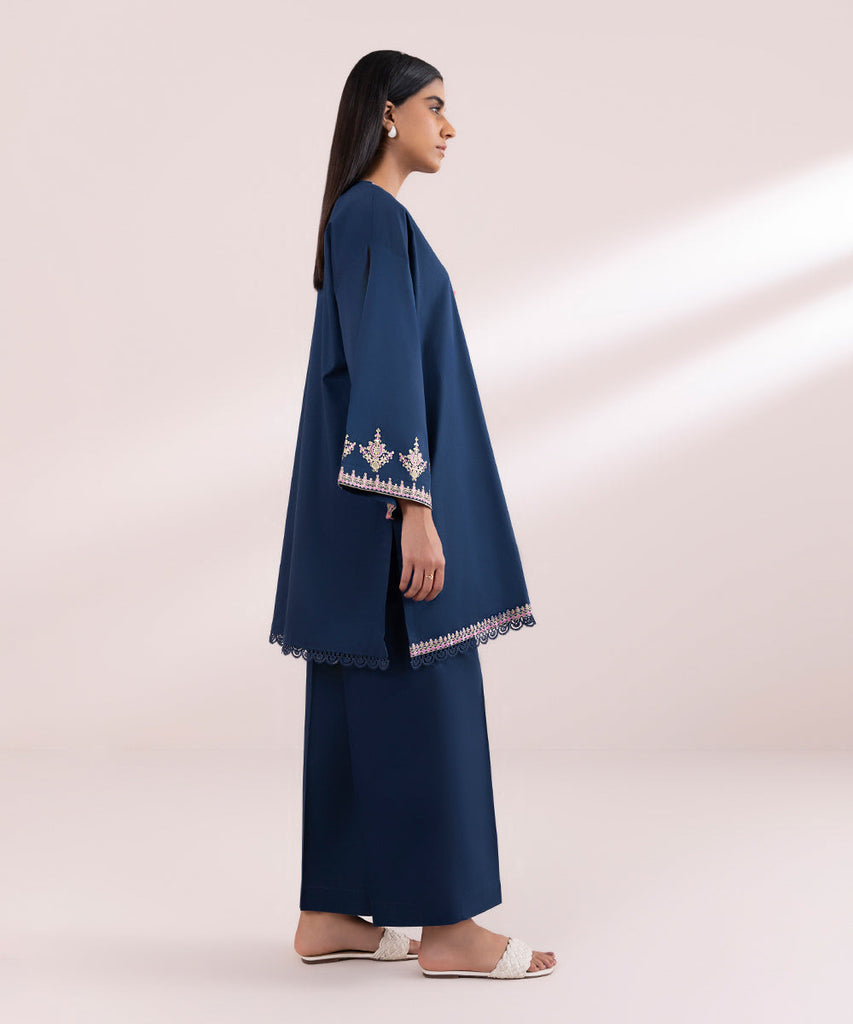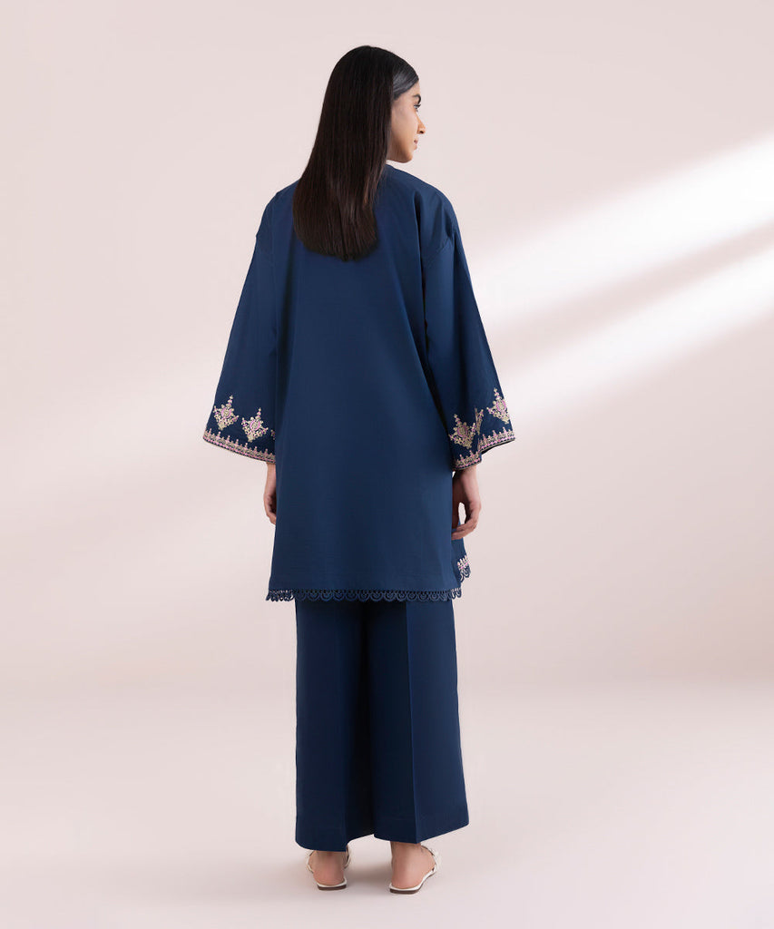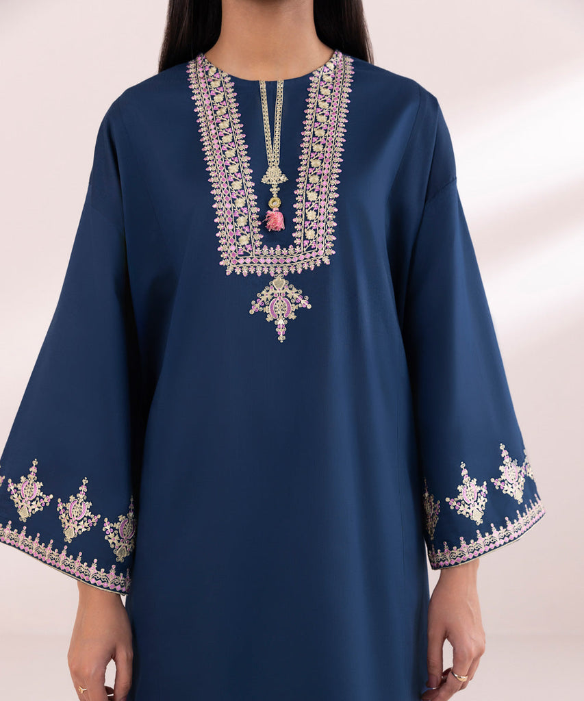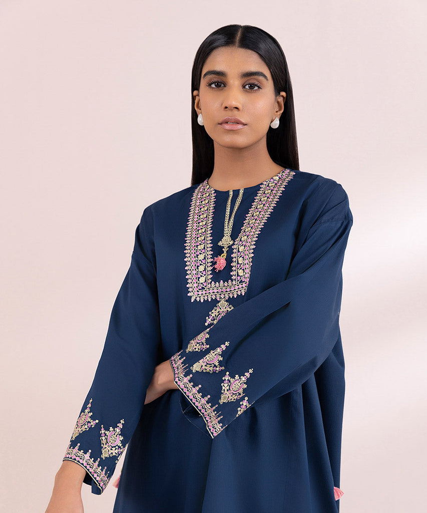 A-Line ShirtCurate a radiant summer look in our embroidered dobby, indigo blue, long A-line shirt with lace detailing...