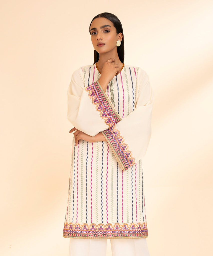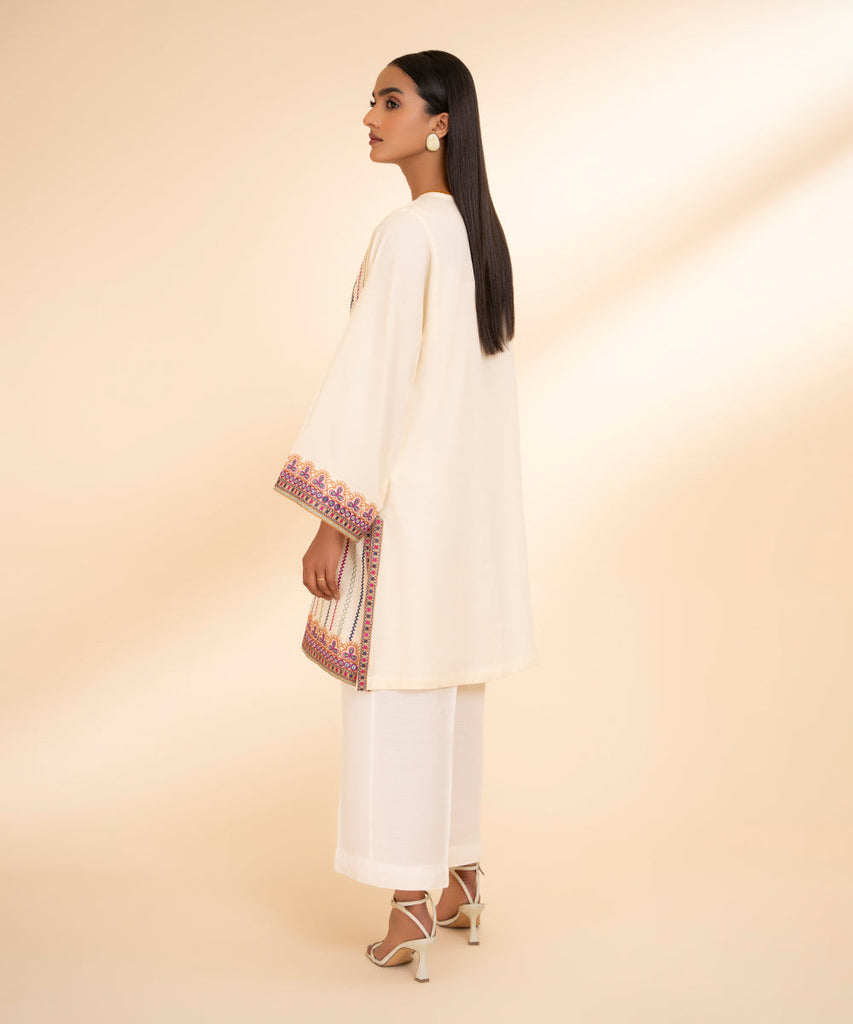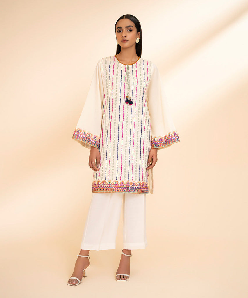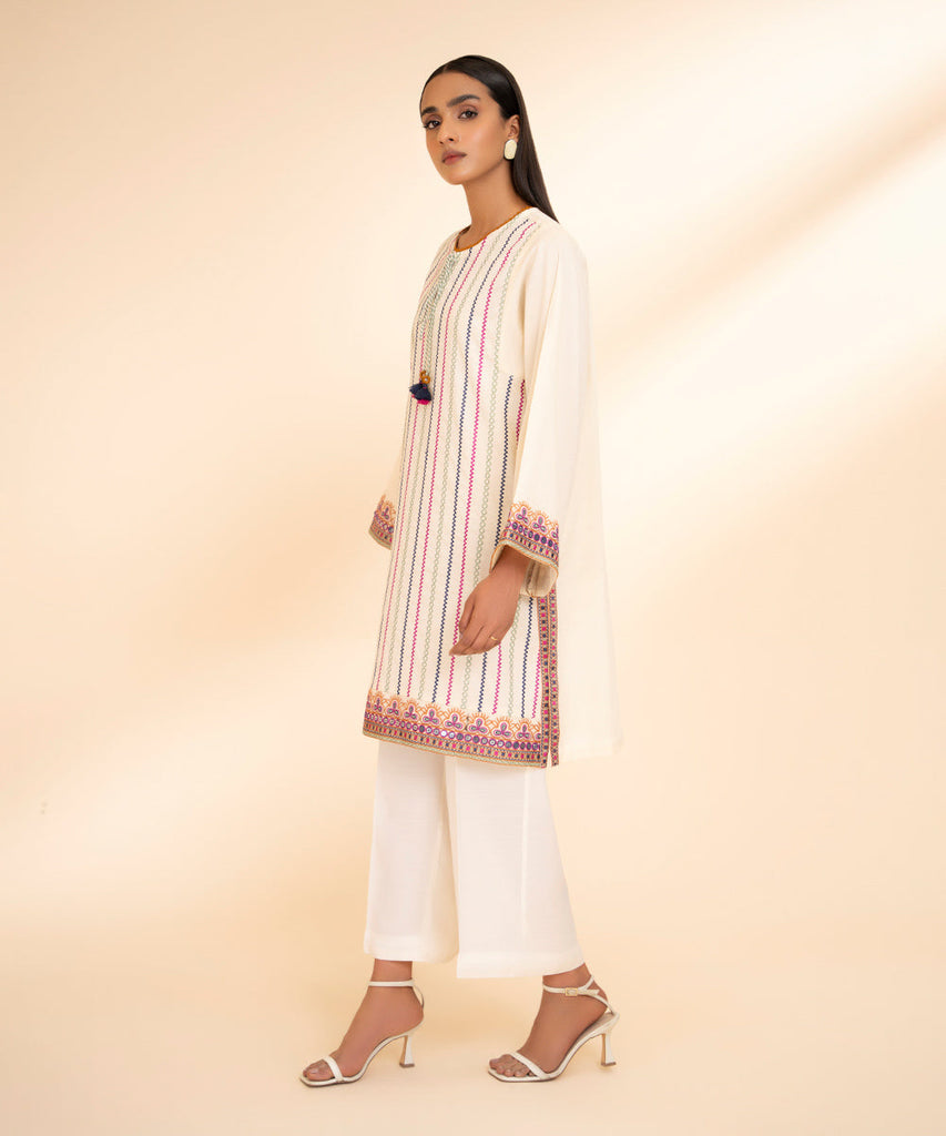 Opt for traditional style this Eid with our cream white, embroidered dobby, A-line shirt.
