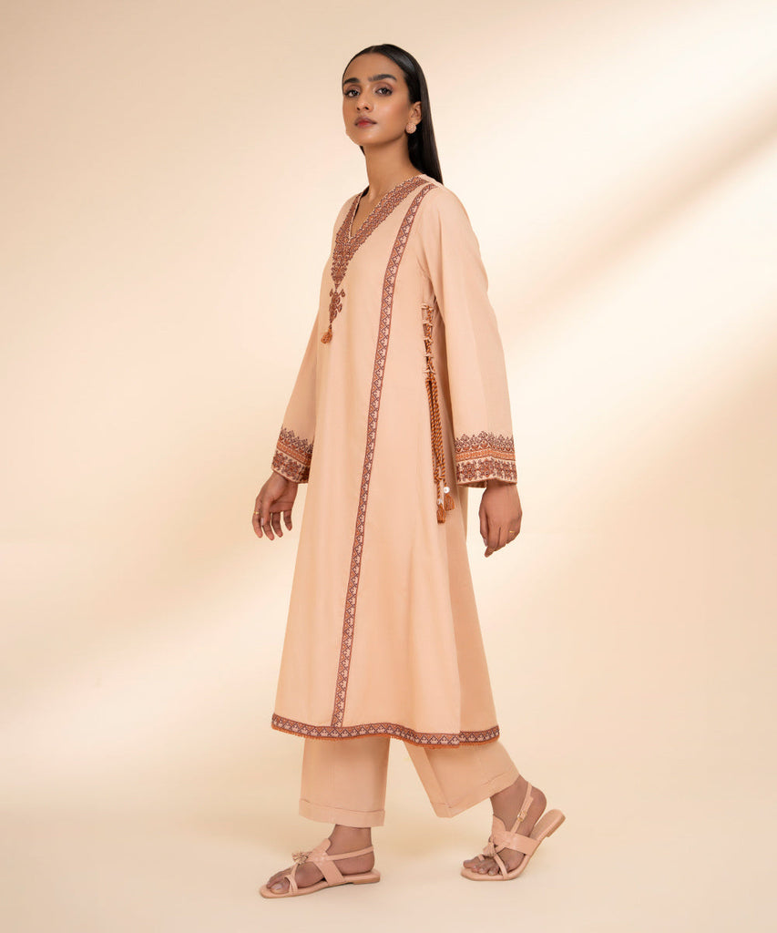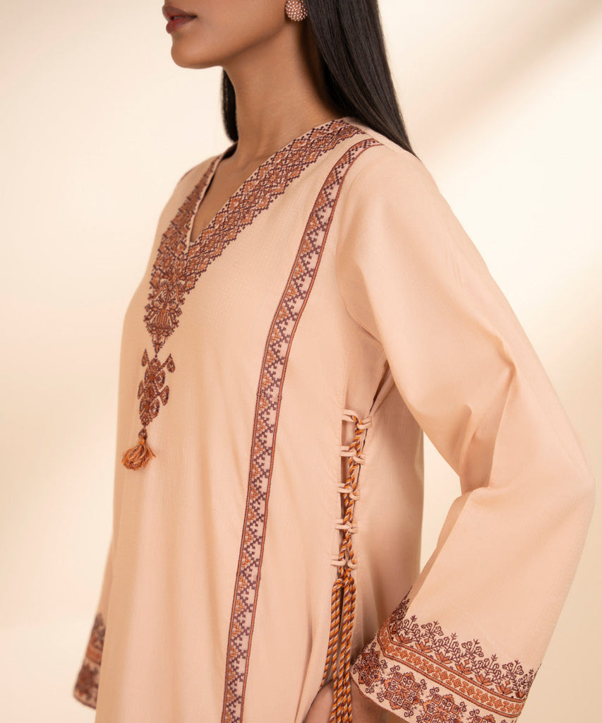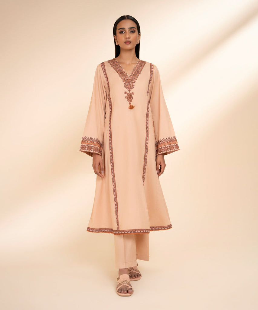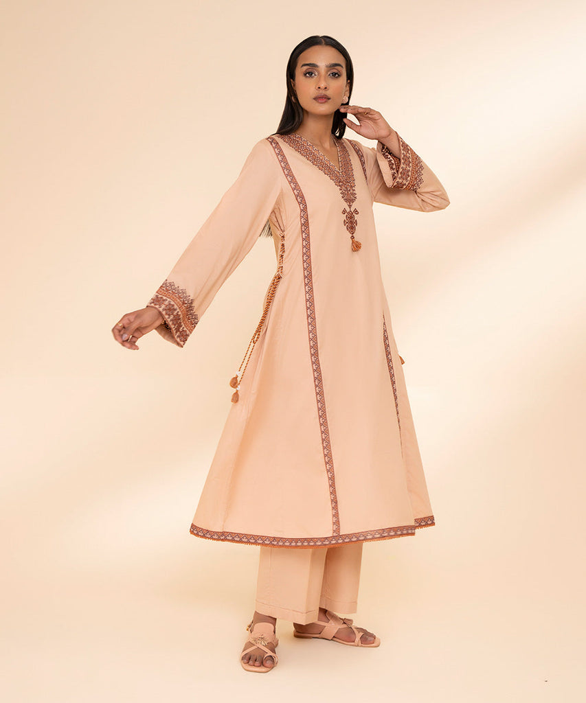 Opt for traditional style this Eid with our sand beige, flared A-line, dobby shirt accentuated with embroidery.