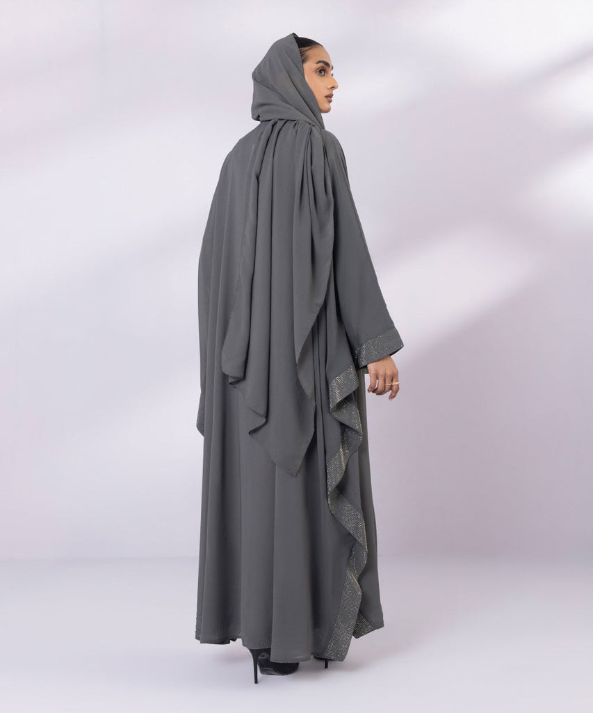 Full length, front open abaya set in soft drapey chiffon fabric. With diamanté detail on front, sleeves and hijab.Det...