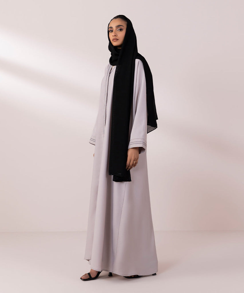 Full length abaya in soft drapey fabric. Button through front opening with V-neckline and full sleeves with stitch detail on placket and sleeve cuff.