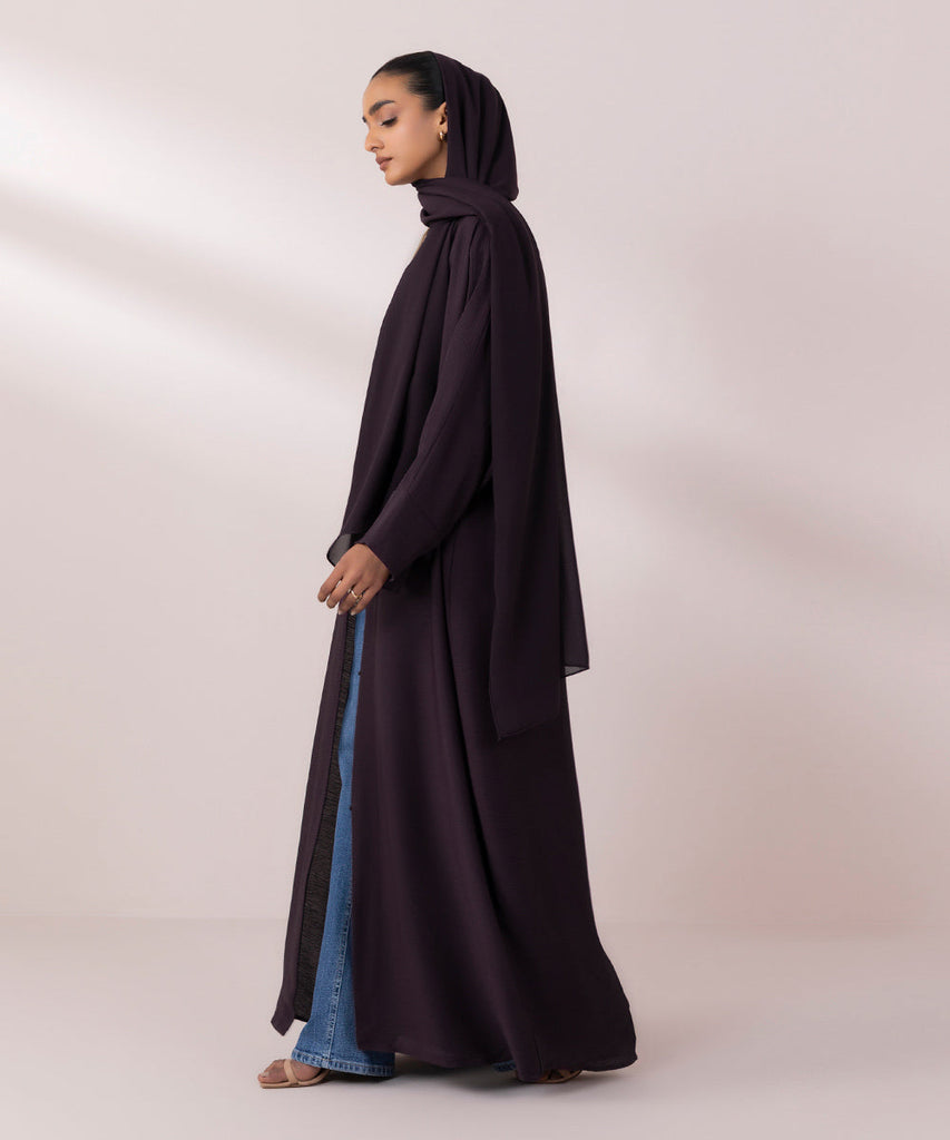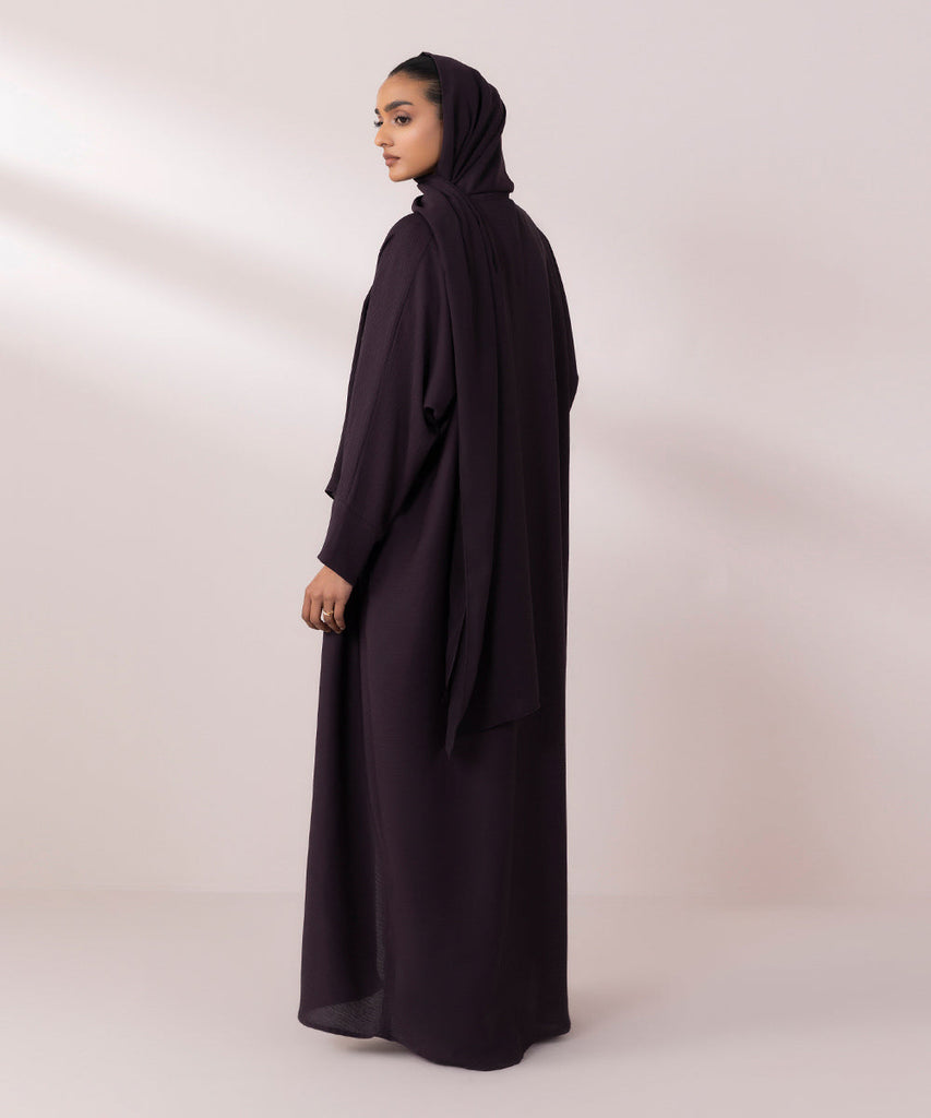 Full length abaya in crinkle fabric with kimono sleeves and tapered cuffs. Button through front opening. Hijab included.
