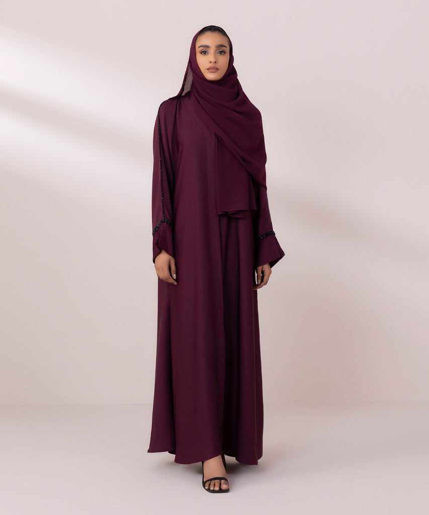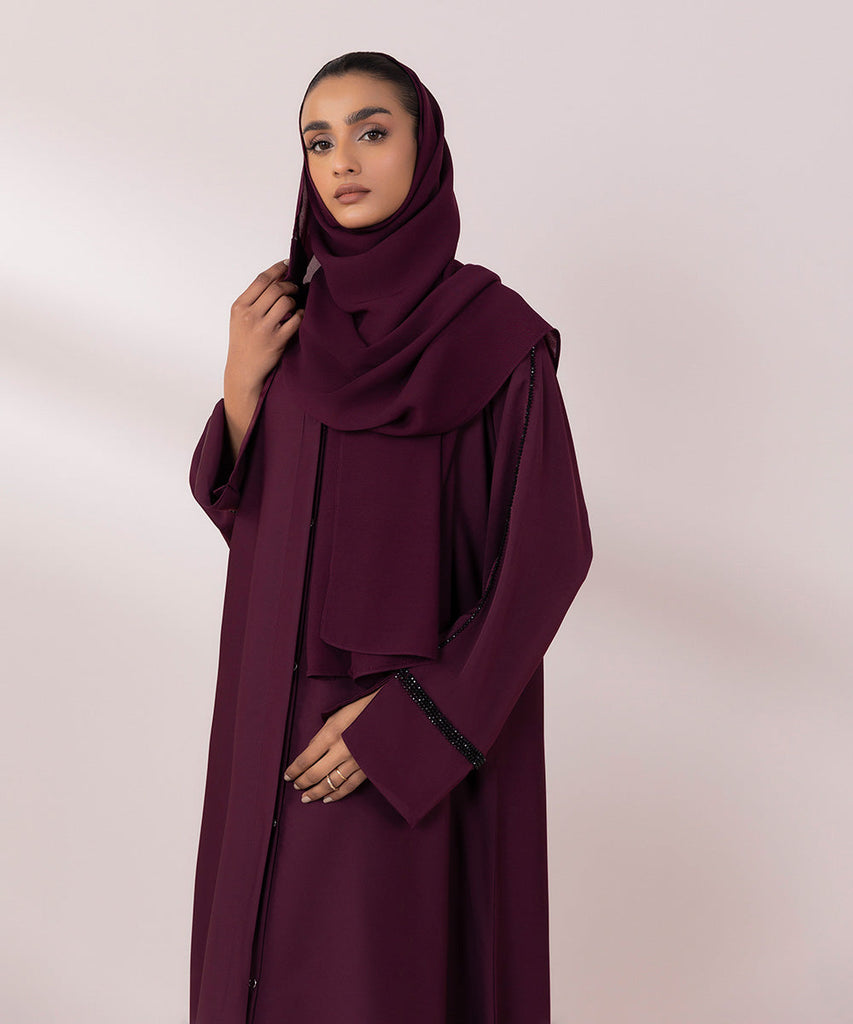 Full length abaya in soft drapey fabric featuring a V- neckline with button through front opening. Full sleeves with a slit on the cuffs. Hand embellishment on sleeves and hijab.