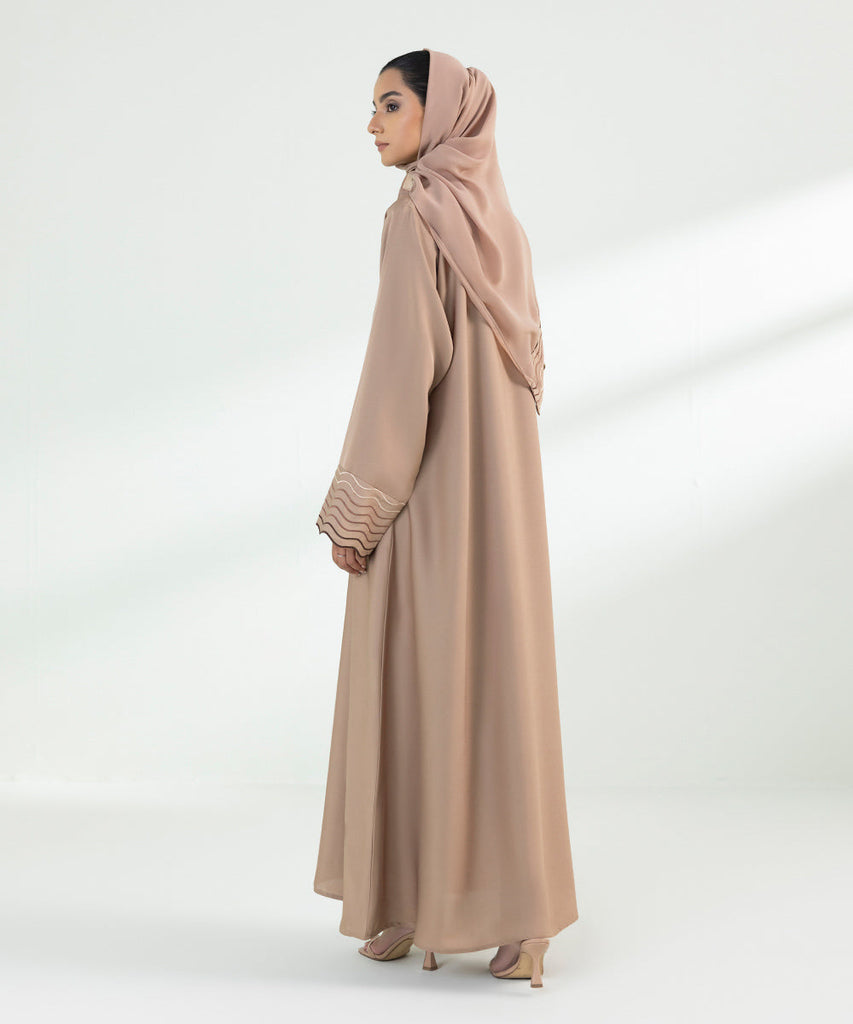 Full length abaya set in soft and drapey fabric. Featuring V neckline with button through opening. Ombre embroidery on sleeves with scalloped edges. Hijab included.