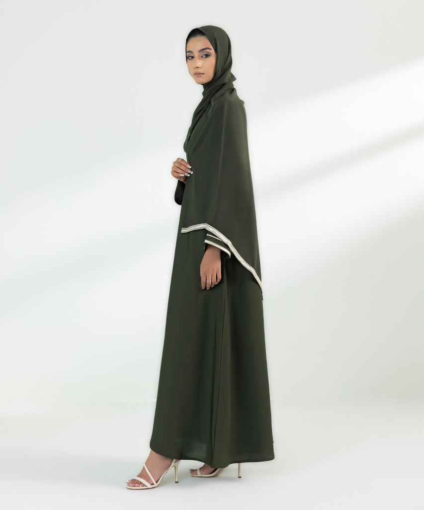 Full length abaya set in soft, drapey fabric. Button through front opening with V neckline and full length kimono sleeves with embroidery detail on the sleeves. Hijab included.