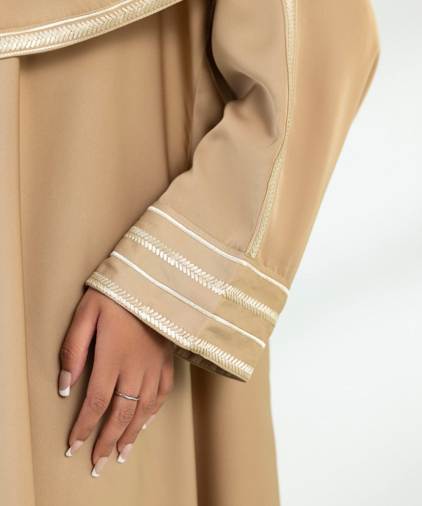 Full length abaya set in soft, drapey fabric. Button through front opening with V neckline and full length kimono sleeves with embroidery detail on the sleeves. Hijab included.