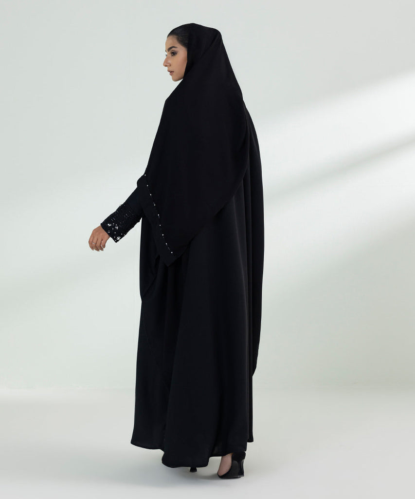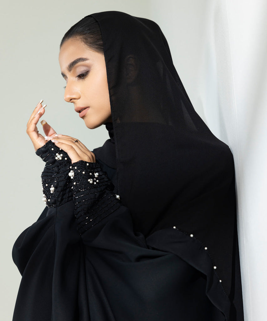 Full length kaftan abaya set in soft, drapey fabric. Featuring crew neckline with long slit and fabric button closure. Hand embellished detail on fitted cuffs. Hijab included.