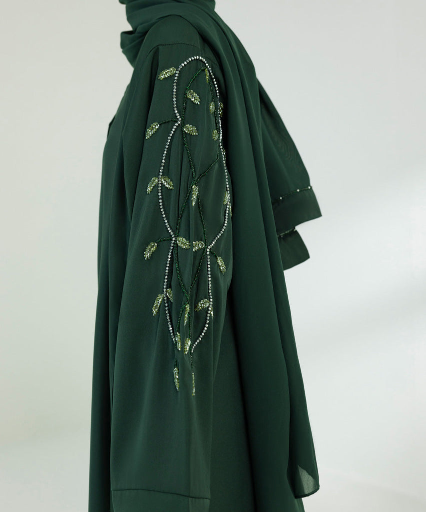 Full length abaya in soft, drapey fabric featuring V neckline with button through front opening. Full sleeves with hand embellishment. Hijab with embellished details.