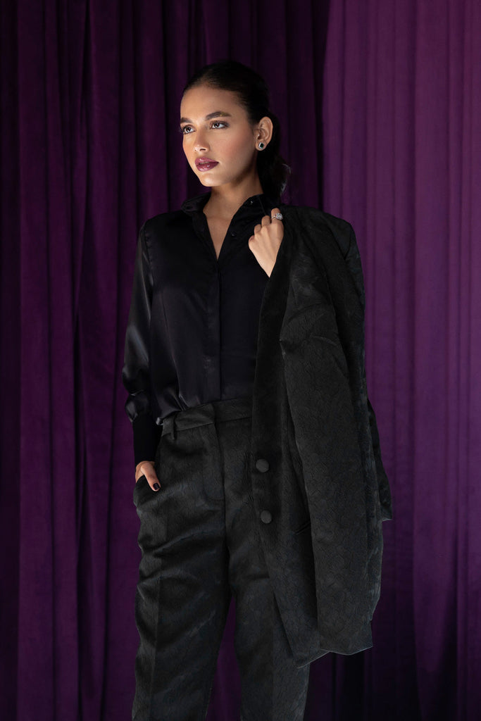 Jacquard tailored trousers with fixed belt. Zip closure. Side pockets and back faux pockets.