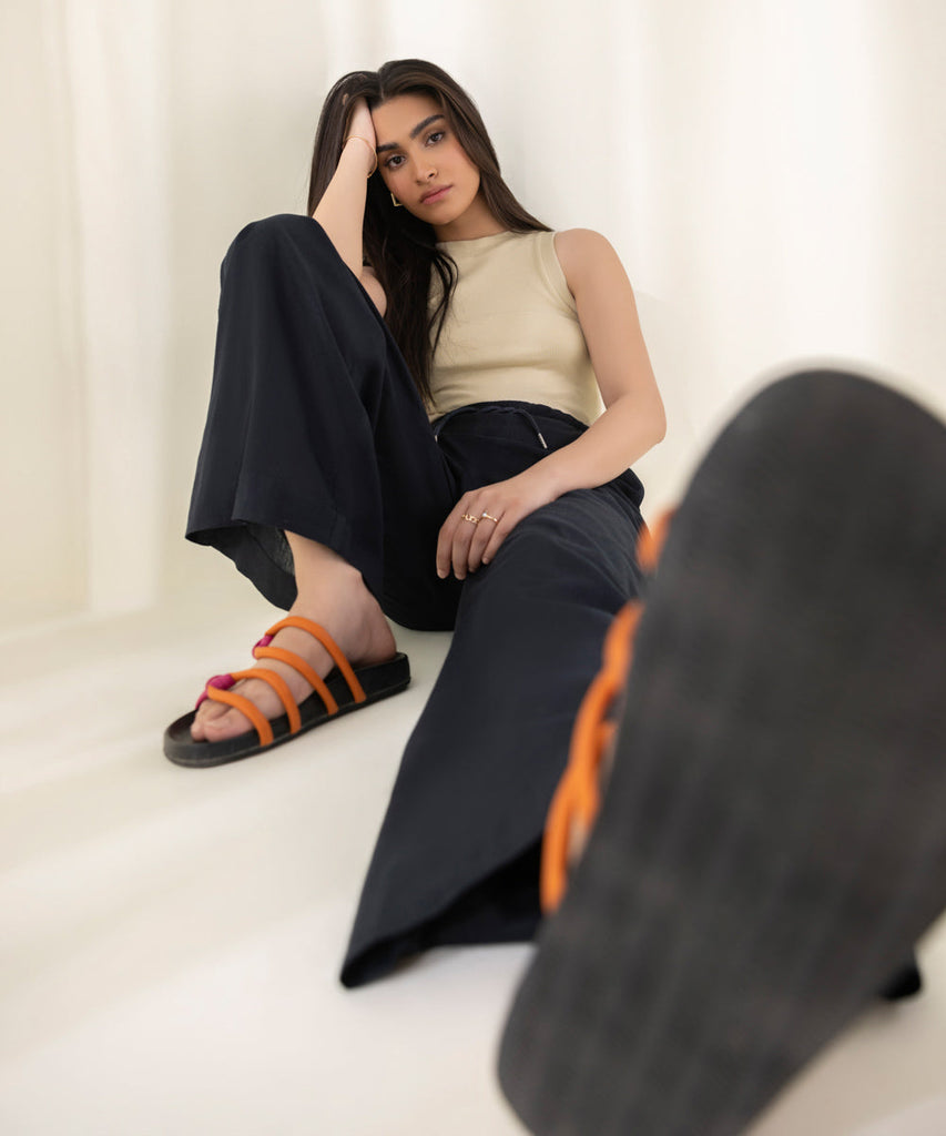 Wide leg, pull-on trousers with elasticated waist and drawcords. Side pockets.