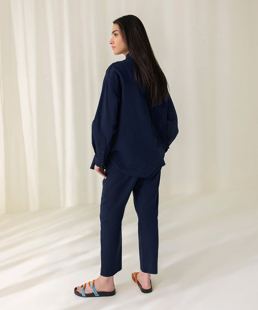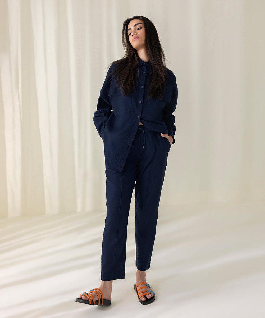 Tapered linen trousers with drawcord and elasticated waistband. Side pockets and back faux pockets.
