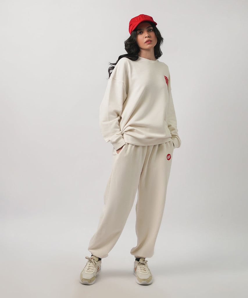 Loose-fit jogging trousers with elasticated waist and draw-cords. Side pockets. Cuffed hem. Back patch pocket. Embroidered badge on front.