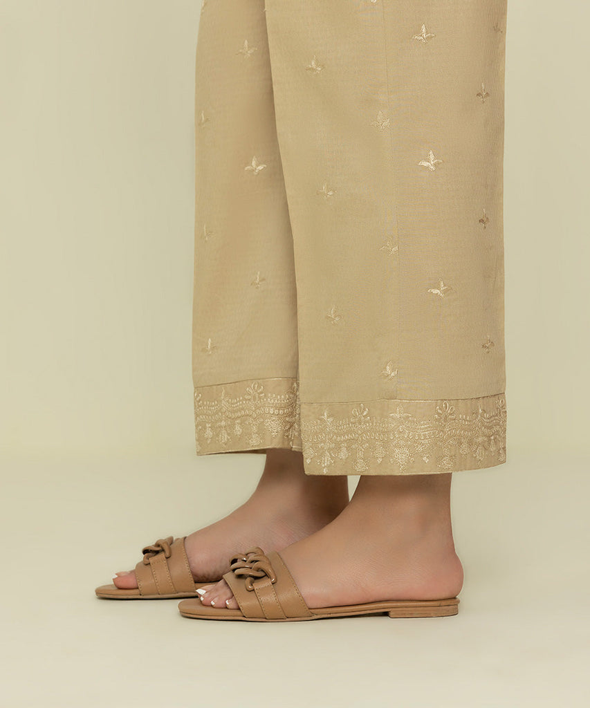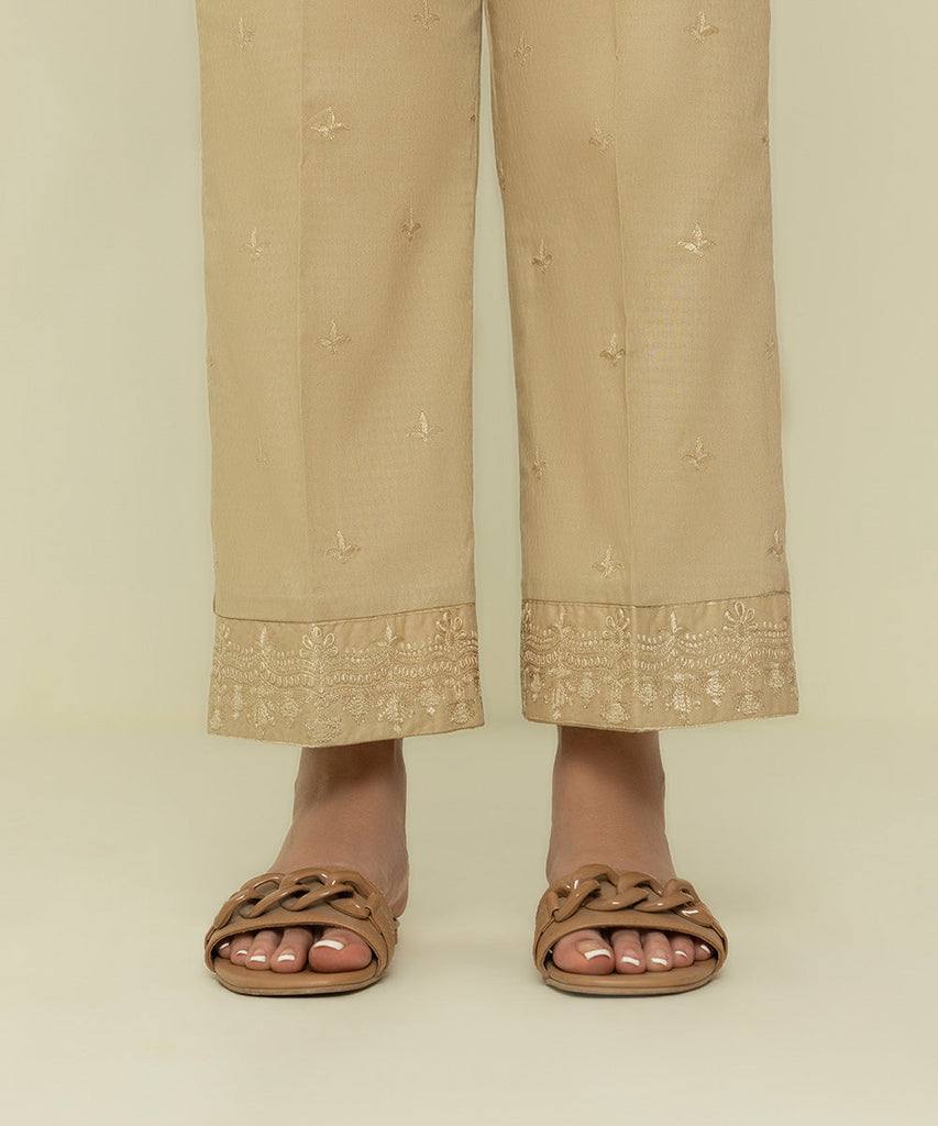 Elevate your outfit with beige dobby pants featuring embroidered hem.  Cigarette Pants Colour: Beige Fabric: Dobby SI...