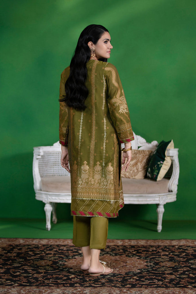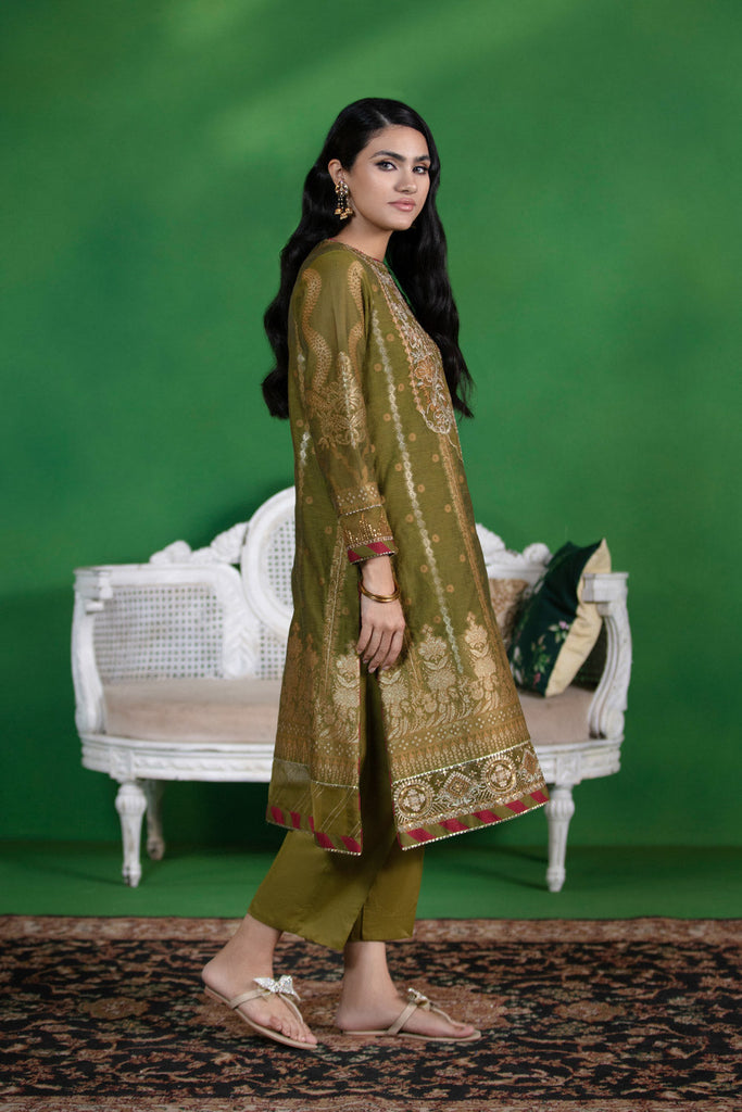 Celebrate the festive season in this ready-to-wear rich, olive green ensemble with golden embroidery, and raw silk straight trousers.