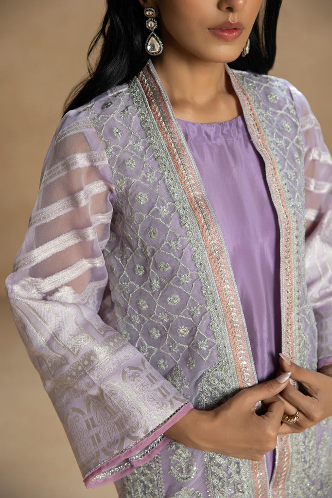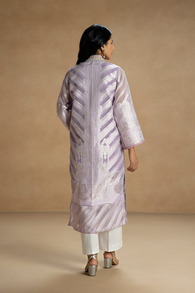 A Line Open Shirt with Slip Strut in style with this purple jacquard A-line silhouette.