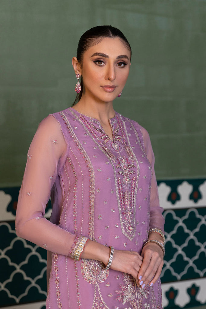 Adorn lilac hues with this embroidered organza A line silhouette with embroidered front.