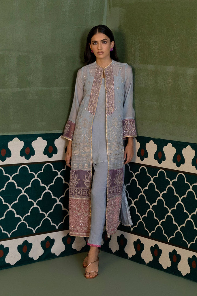 For a statement look, adorn sky blue front open silhouette with embroidered neckline and borders in khaddi net.