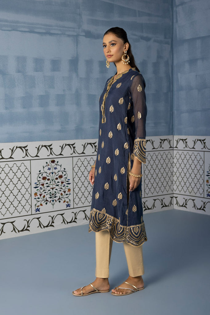 A Line Shirt Adorn grace with this blue A line silhouette in khaddi net with embroidered front and back. Details: E...