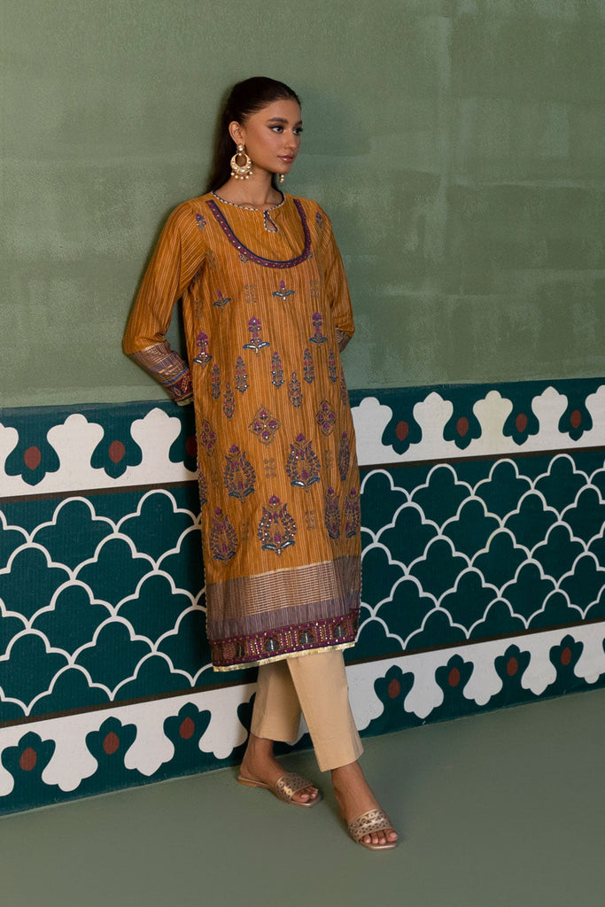 Look refreshing with this mustard hued embroidered A line ensemble featuring round neck with keyhole.