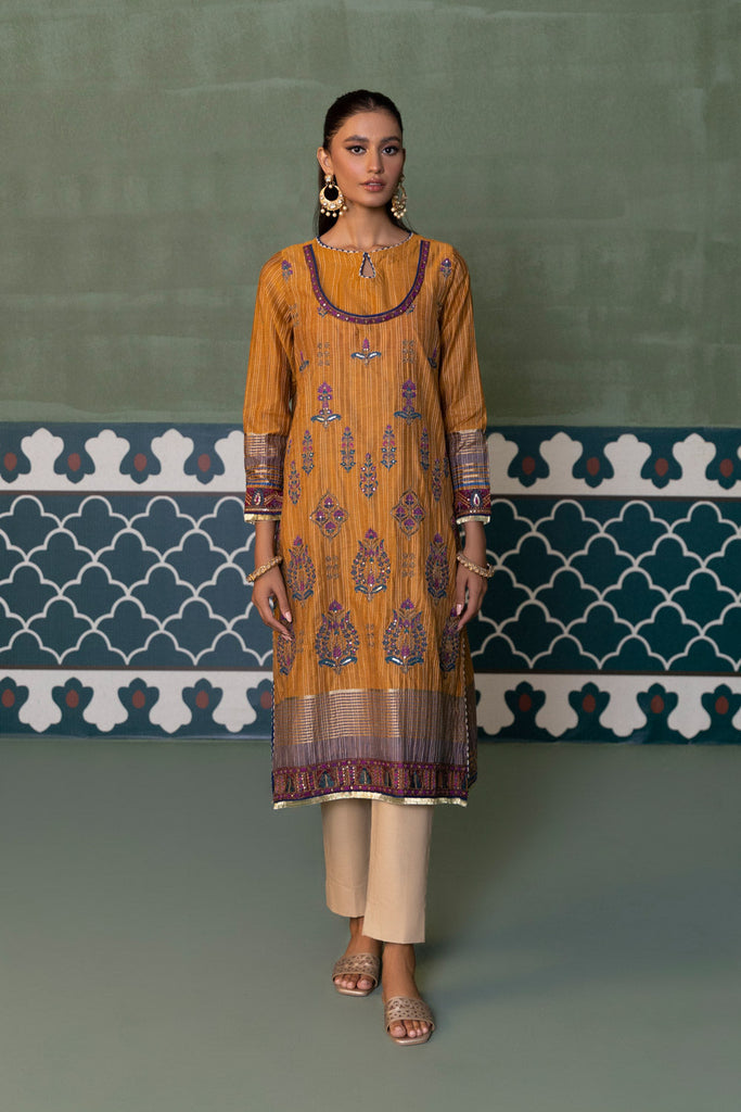 A Line Shirt Look refreshing with this mustard hued embroidered A line ensemble featuring round neck with keyhole. D...