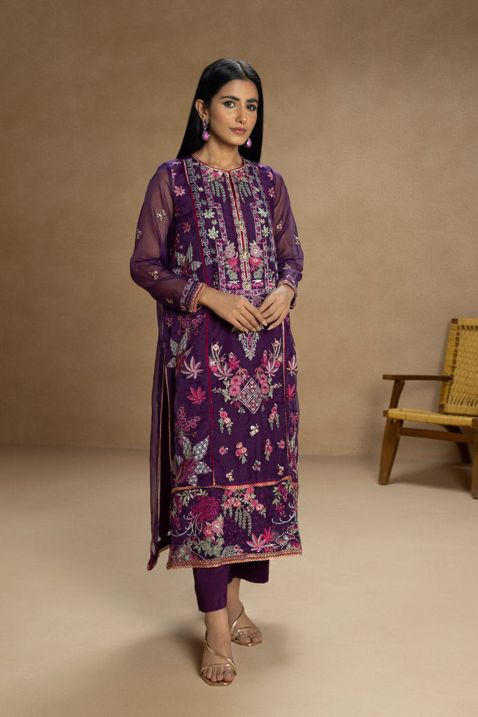 Step into the festive season with this purple hued embroidered A-line silhouette paired with a straight trouser.
