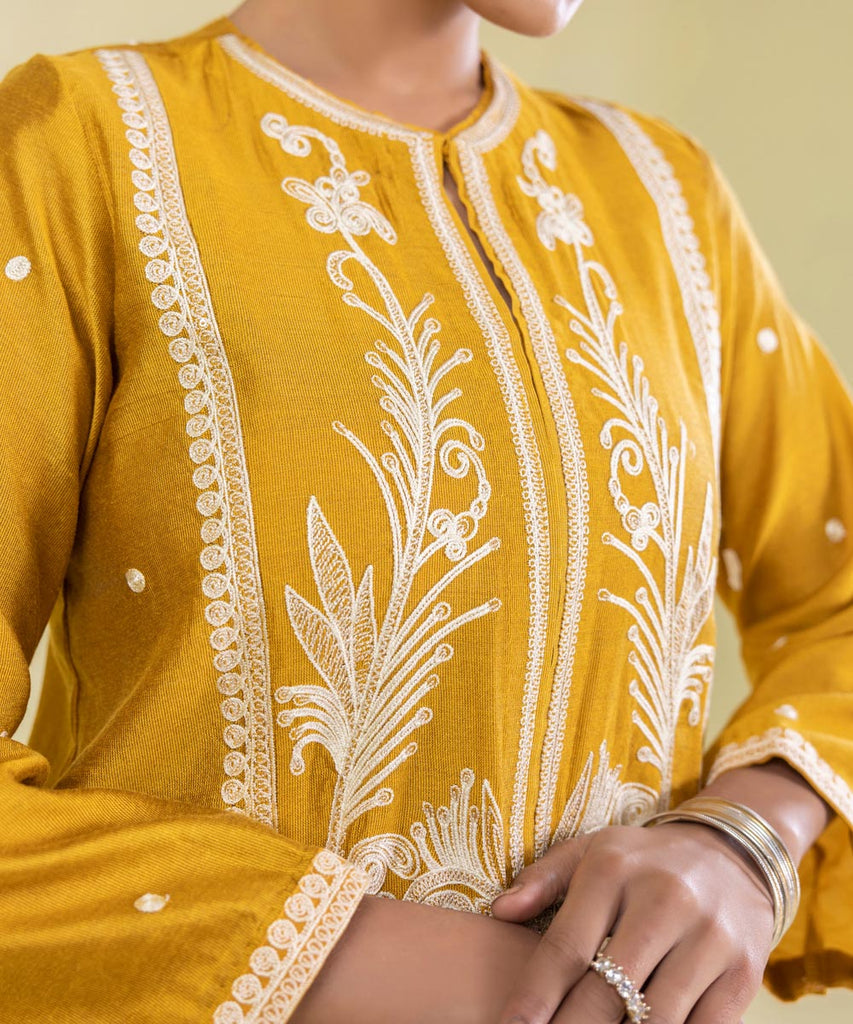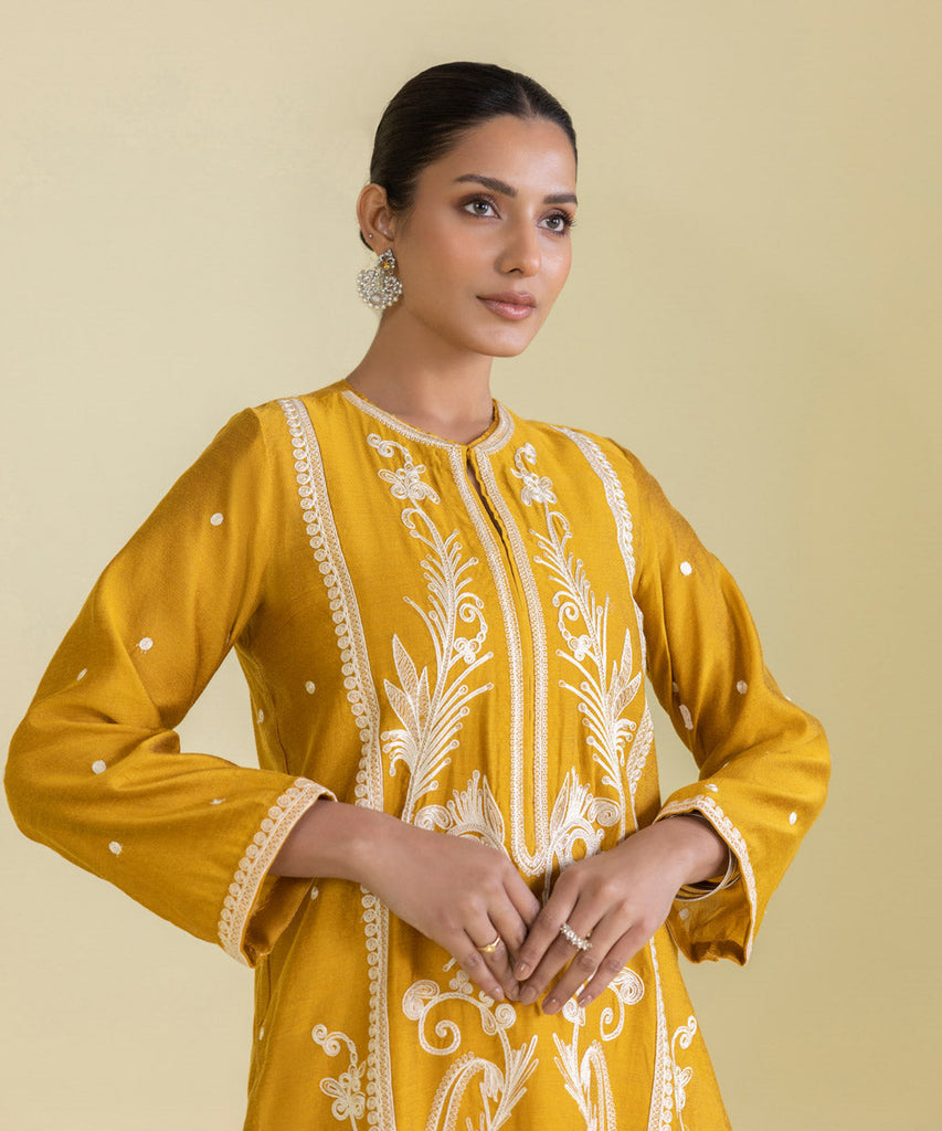 A Line Shirt Turn heads in this mustard embroidered A-line silhouette curated in silk cotton net. Details: Embroider...