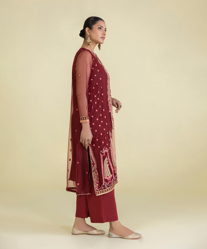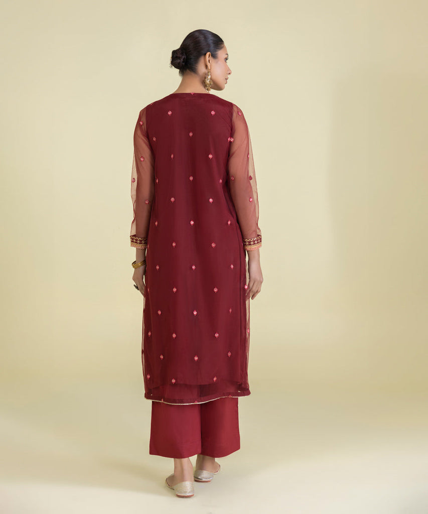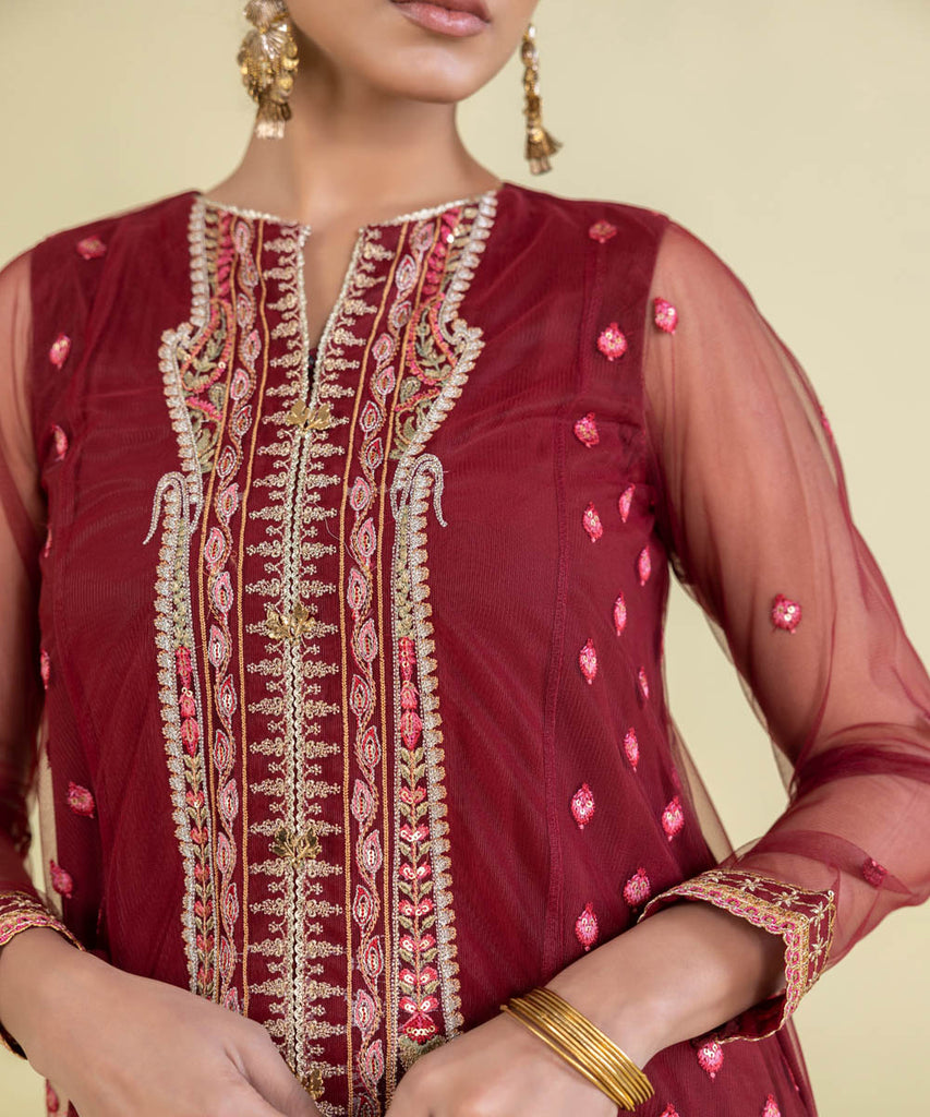 Exude confidence with this maroon A-line silhouette featuring intricate embroidery all over front.