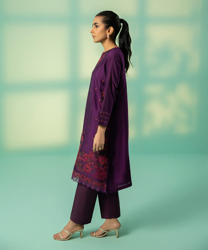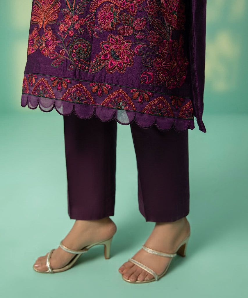 Refresh your look with this purple A-line panelled embroidered khaddi net shirt with round neckline. Details: Embroid...
