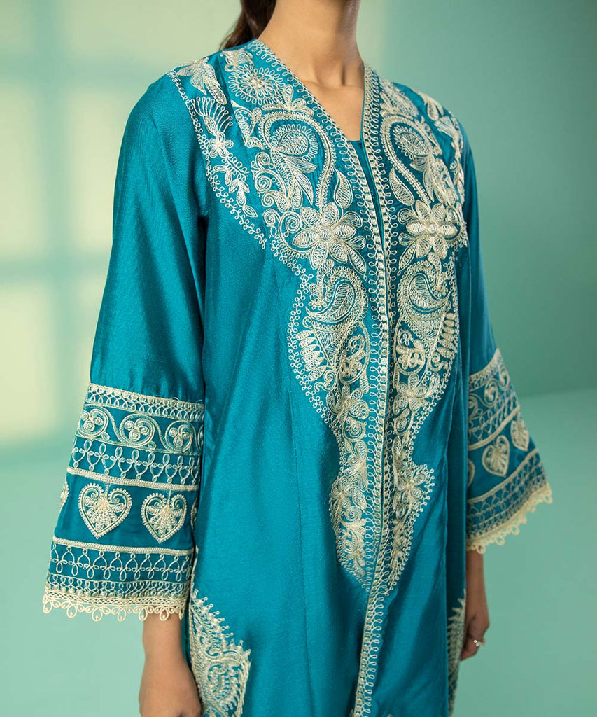 Embroidered front, Plain back, V Neckline, Full Sleeves with Embroidered border.