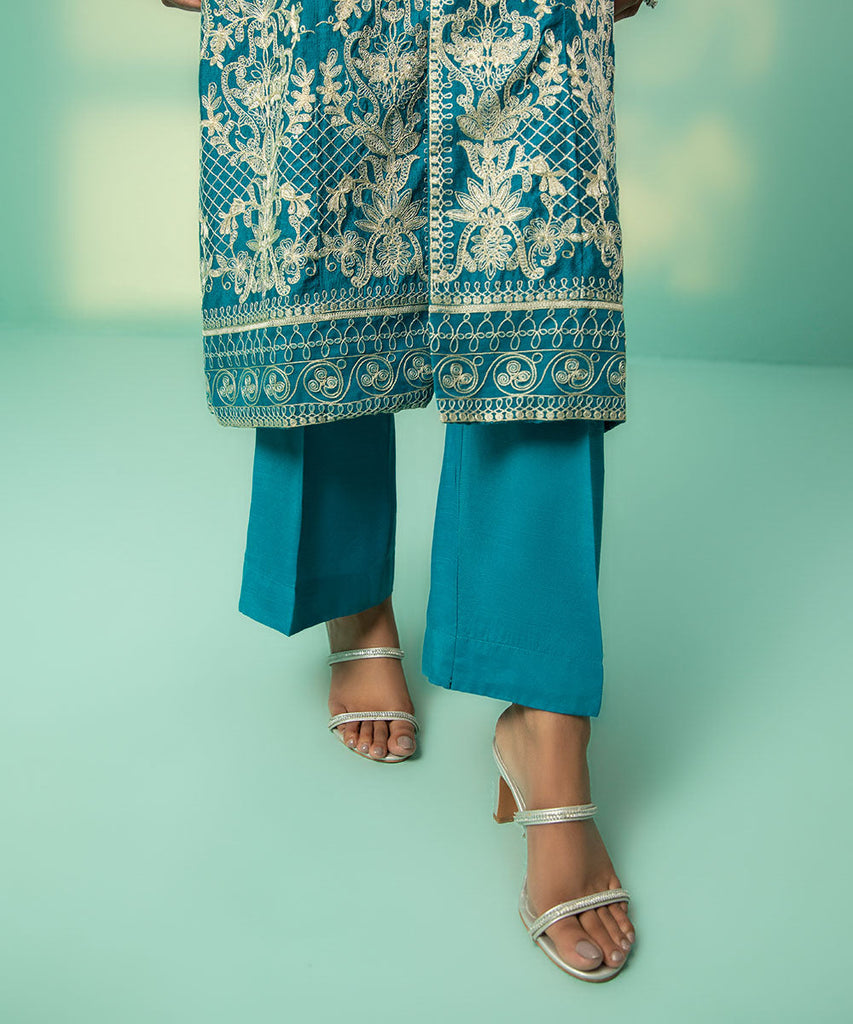 Create a statement in this blue silk cotton net A-line front open shirt with matching viscose raw silk straight trous...