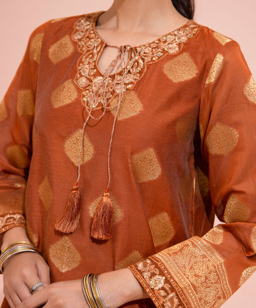 2-Piece Straight Kurta with Trousers Elevate your style with our brown jacquard straight silhouette featuring intrica...
