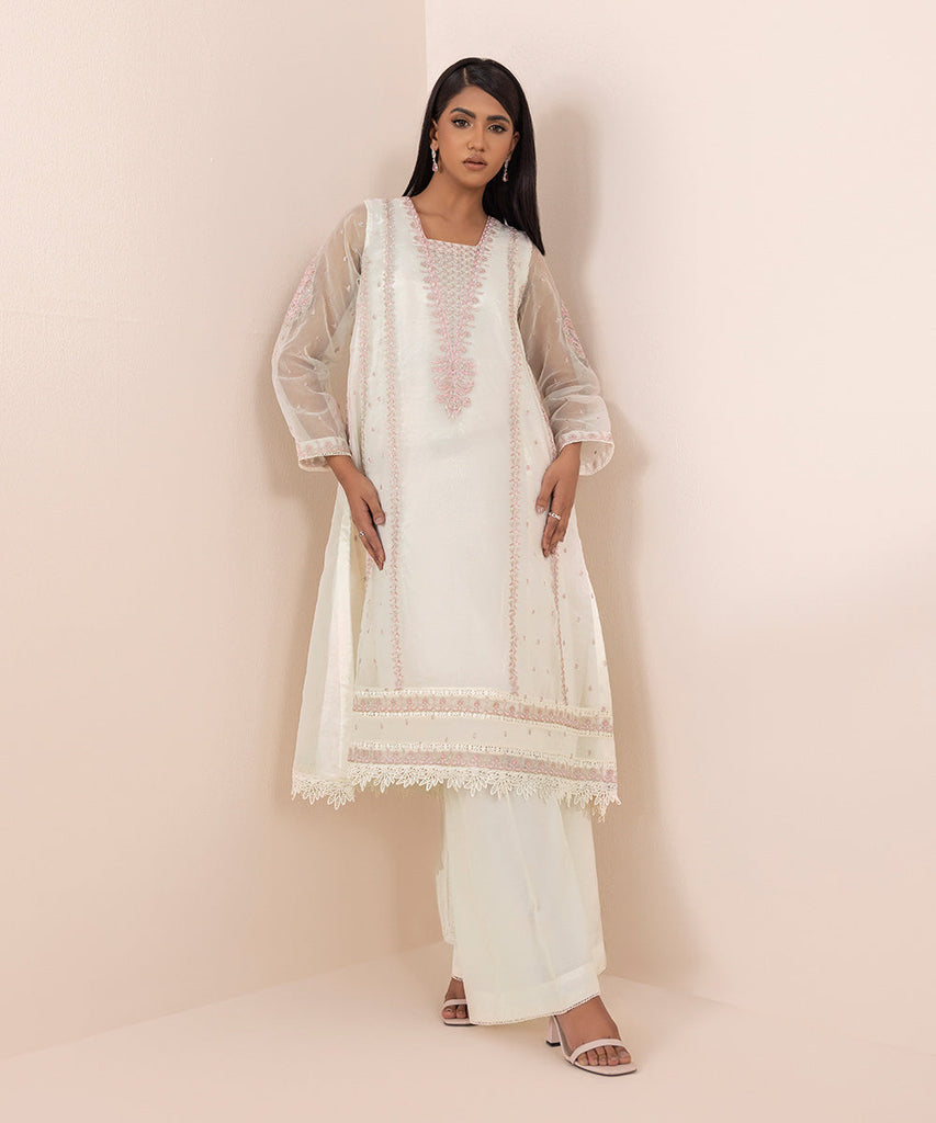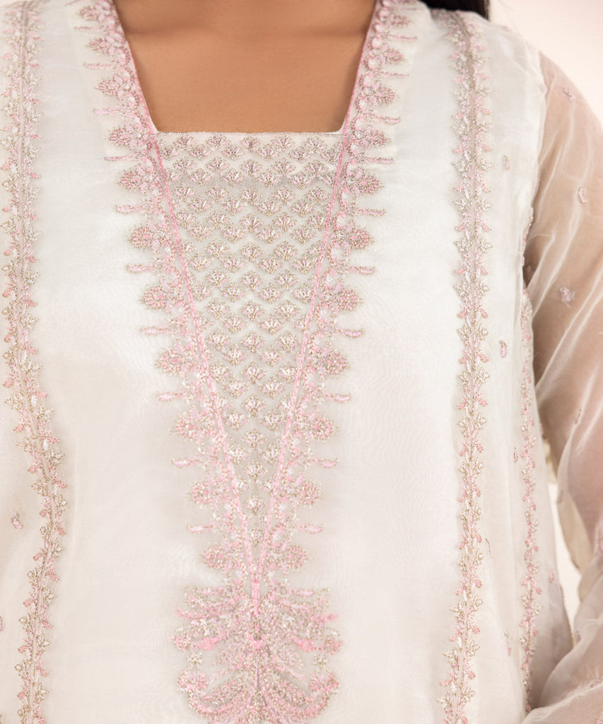 Elevate your festive style with our two-piece embroidered white ensemble, featuring a blended organza A-line shirt and flared viscose raw silk pants.