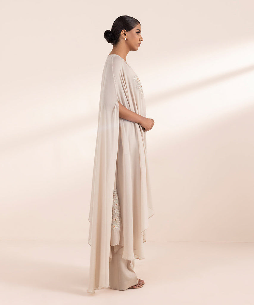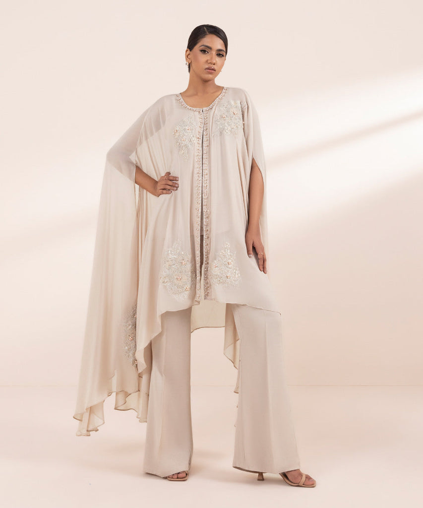 Complete your festive style with our champagne two-piece suit, featuring an embroidered bemberg georgette chiffon kaftan and dyed viscose raw silk bootcut pants.
