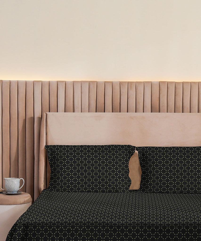 Add dimension to your space with our black, poly cotton fitted sheet and pillowcases, showcasing intricate floral designs.