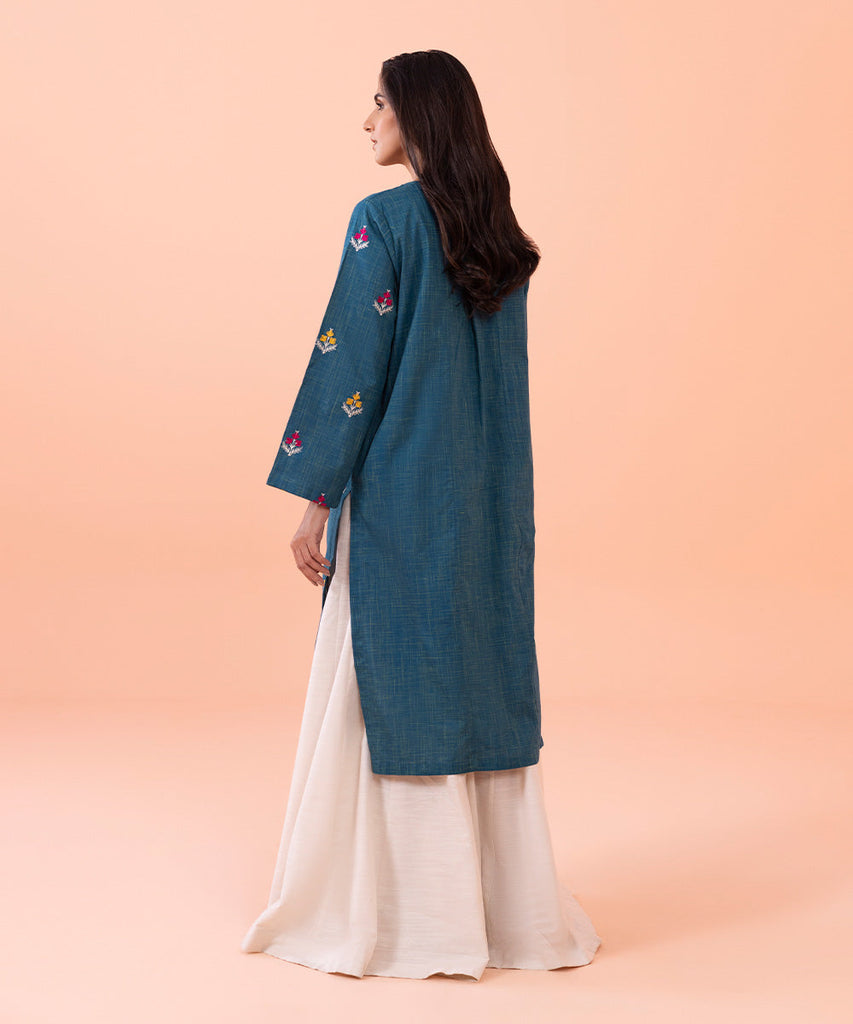 For an elegant allure opt for our bluish green embroidered straight silhouette.
