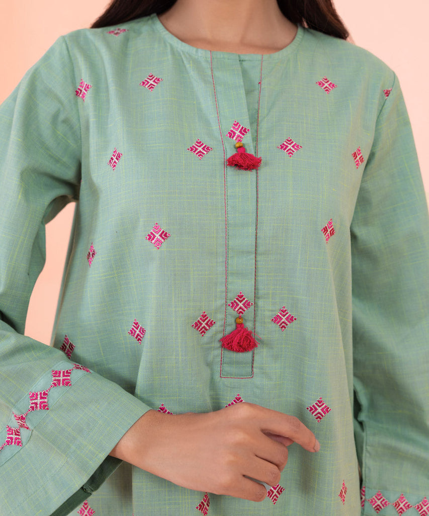 Refresh your wardrobe with our serene sea green two-piece featuring intricate embroidery.