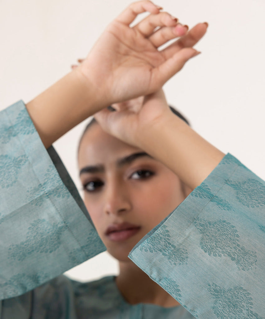 For a timeless appeal, adorn our green jacquard straight paired with straight pants.